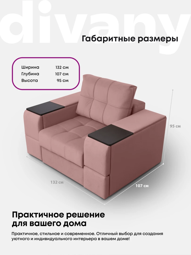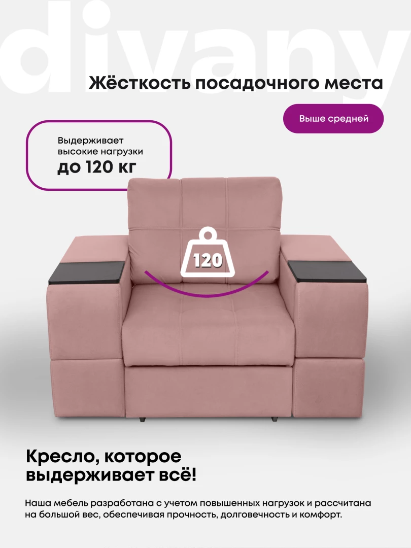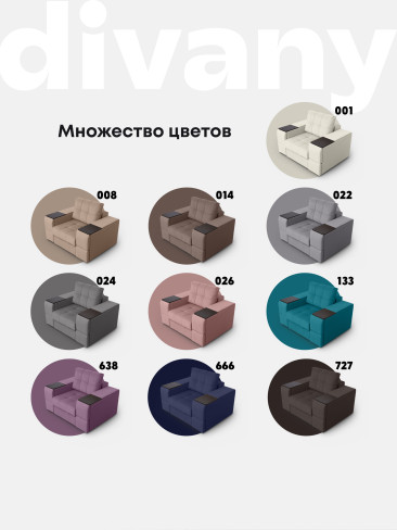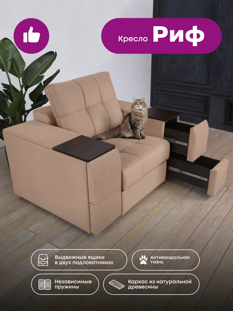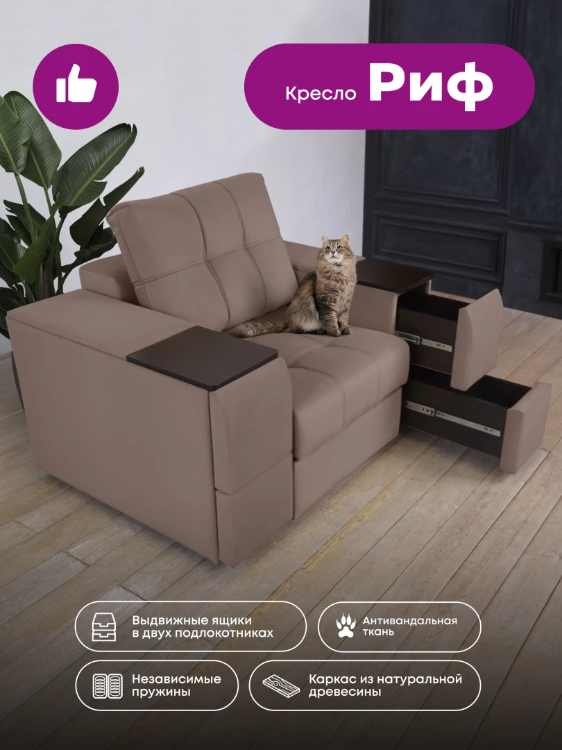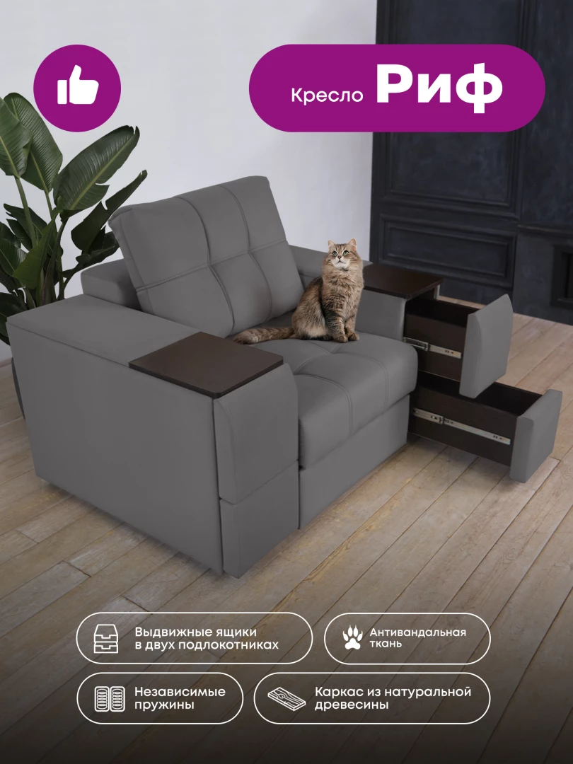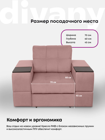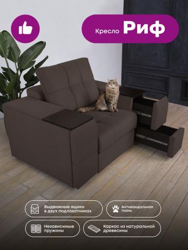 Кресло "Риф" с широкими подлокотниками займет достойное место в интерьере гостиной - в качестве отдельного предмета мебели или в комплекте с диваном. Оригинальный дизайн, удобная посадка и комфорт делают кресло особенно популярным. Оба подлокотника кресла оборудованы выдвижными полочками для хранения различных вещей. В основе кресла - блок независимых пружин и высокоэластичный ППУ. Каркас составляет прочная древесина и ЛДСП высокого класса безопасности, обивка - высококачественный и износостойкий текстиль. Трехслойная антивандальная ткань нового поколения с грязе и водоотталкивающим эффектом.