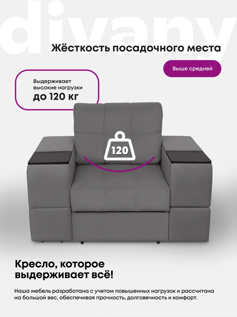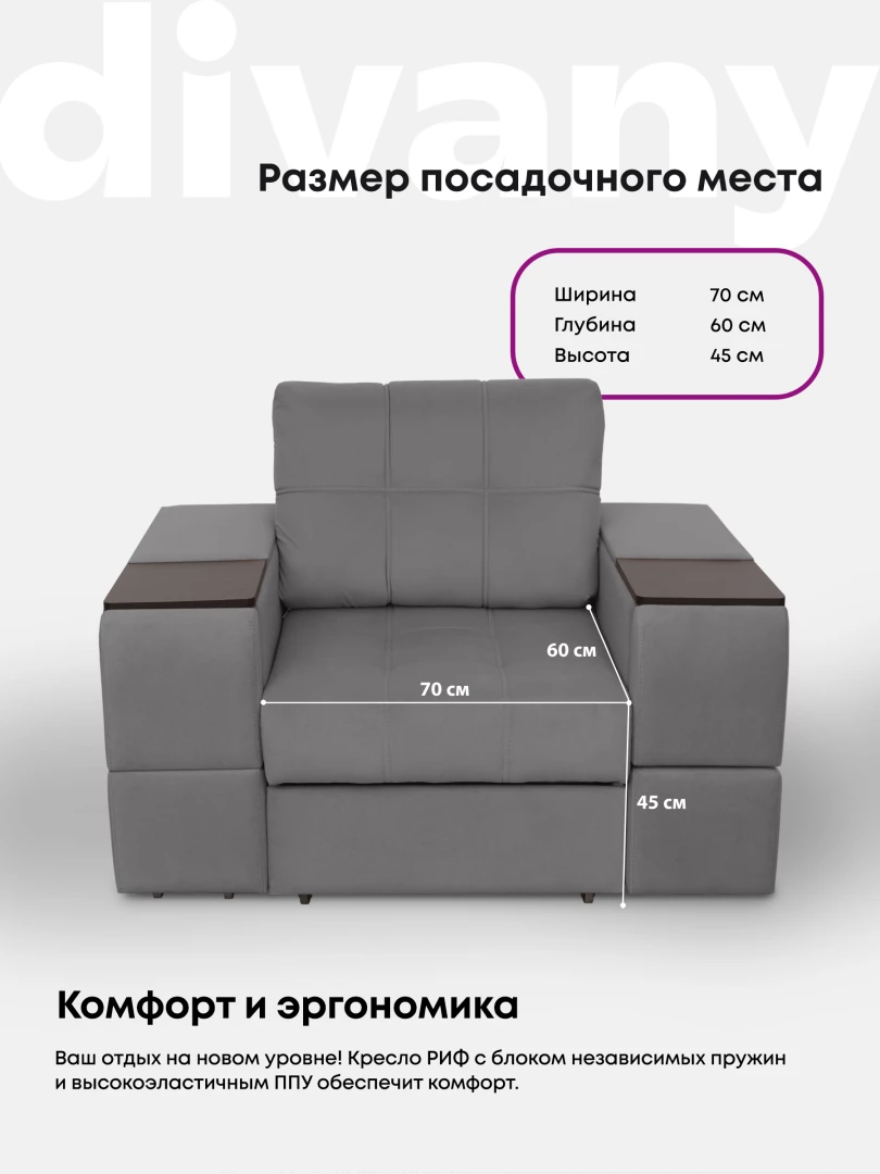 Кресло "Риф" с широкими подлокотниками займет достойное место в интерьере гостиной - в качестве отдельного предмета мебели или в комплекте с диваном. Оригинальный дизайн, удобная посадка и комфорт делают кресло особенно популярным. Оба подлокотника кресла оборудованы выдвижными полочками для хранения различных вещей. В основе кресла - блок независимых пружин и высокоэластичный ППУ. Каркас составляет прочная древесина и ЛДСП высокого класса безопасности, обивка - высококачественный и износостойкий текстиль. Трехслойная антивандальная ткань нового поколения с грязе и водоотталкивающим эффектом. Такое кресло делает отдых комфортнее, ведь буквально под рукой есть раскладной столик в подлокотнике, на который можно поставить бокал, положить книгу или журнал удобен он и при работе с ноутбуком.