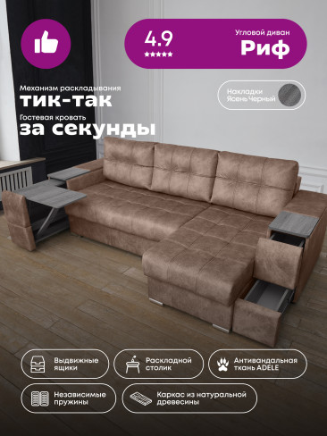 Угловой диван "Риф" в антивандальной ткани Адель с встроенным столиком и выдвижными ящиками, накладки дуб венге коричневый (браун) правый угол (Распродажа)