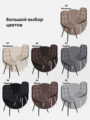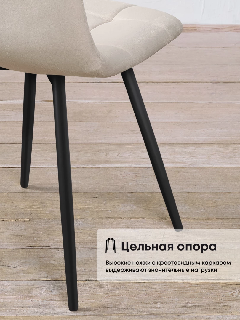 Высокие конусообразные ножки стульев с крестовидным каркасом обеспечивают не только эстетическую привлекательность, но и превосходную стабильность. Они способны выдерживать значительные нагрузки, что делает стулья «Лукас» идеальным выбором для семейных обедов и вечеров в кругу друзей. Опоры стульев «Лукас» выполнены из прочного металла и покрыты матовой порошковой краской. Это не только придает им элегантный вид, но и обеспечивает защиту от коррозии и повреждений. Таким образом, вы можете быть уверены, что стулья «Лукас» прослужат вам долгие годы, сохраняя свою первозданную привлекательность. В целом, стулья «Лукас» в мягкой обивке из велюра - это не только функциональная и прочная мебель, но и стильное дополнение к вашему кухонному интерьеру. Они создают атмосферу уюта и комфорта, позволяя вам наслаждаться приятными моментами за столом в кругу близких людей. Благодаря прочной конструкции стулья выдерживают вес до 100-120 кг. Вес самих стульев колеблется в пределах 4-4,5 кг, объем каждого составляет от 0,08 м3 до 0,1 м3.