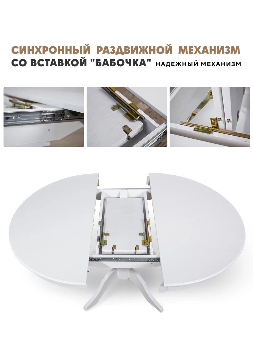 Раздвижные столы, с механизмом вставки «бабочка» — отличный вариант как для повседневного использования стола, так и для праздничных моментов. Увеличение плоскости стола производится быстро и удобно и позволяет использовать большую площадь, для большего количества людей.