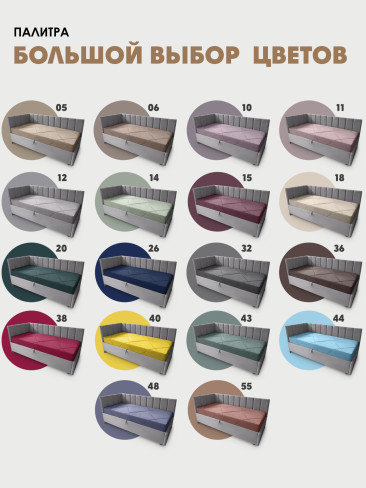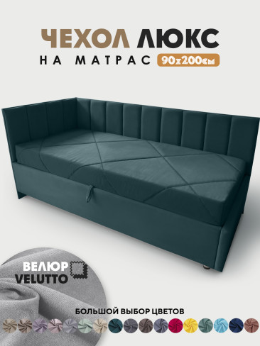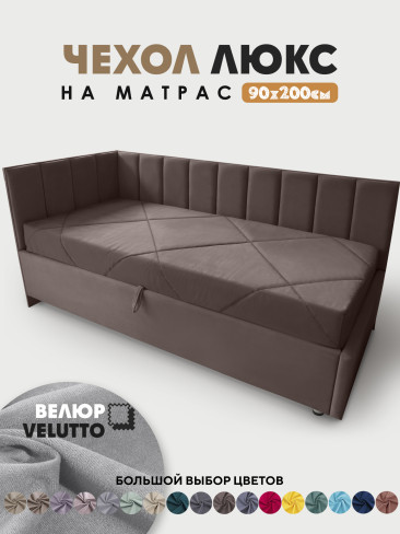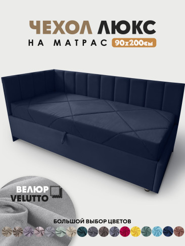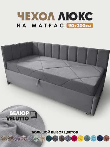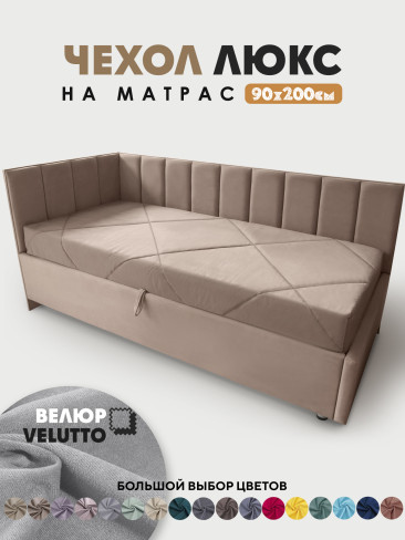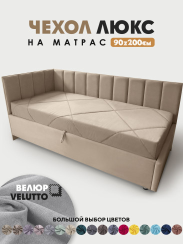 Оформление матраса в чехол в материале как у кровати, делает законченным общий вид и позволяет сделать из кровати диван. Чехол изготавливается из велюра Velutto, можно выбрать в цвет кровати или же можно сыграть на контрасте, подобрать подходящий.