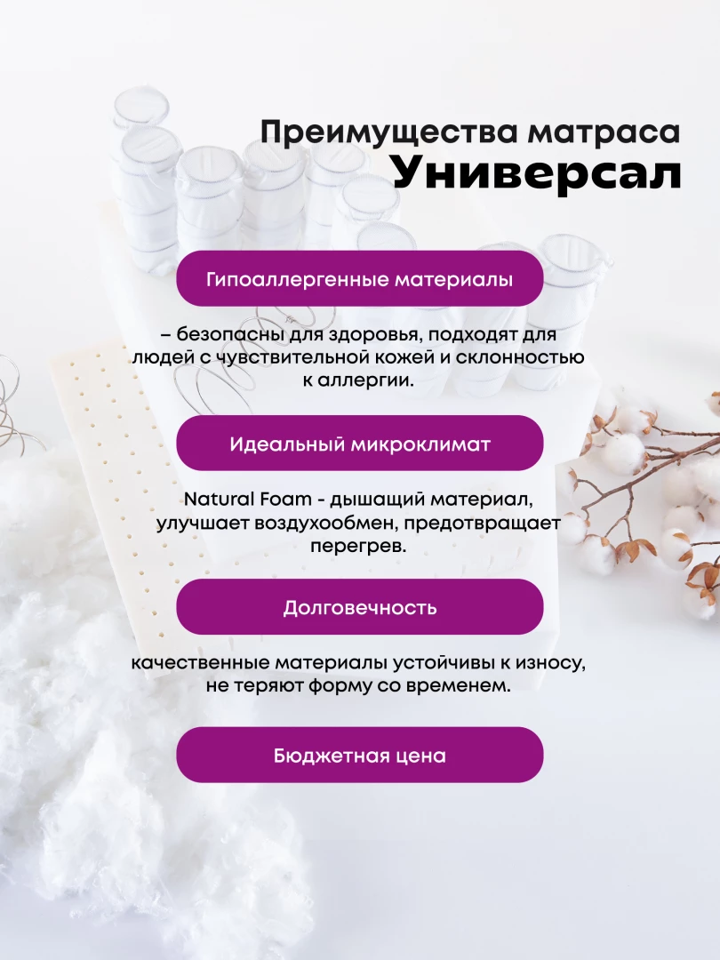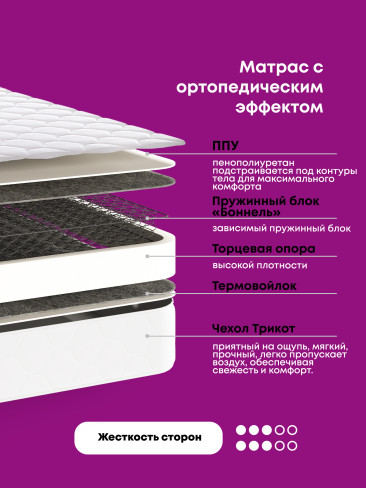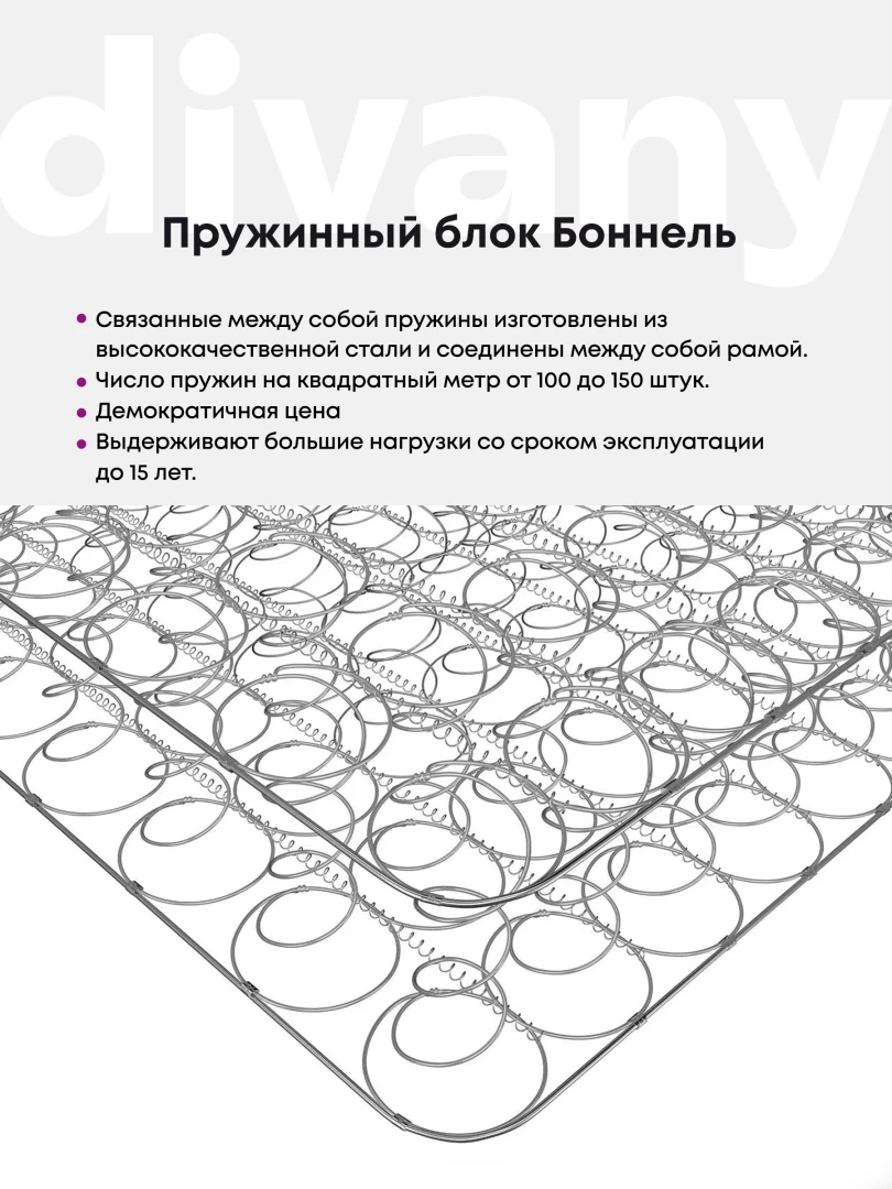 Матрас «Универсал» с блоком зависимых пружин – изделие для сна с традиционным пружинным блоком. Ранее матрасы боннель использовались повсеместно. Им на смену пришли более современные матрасы с независимыми пружинными блоками, но от этого они не стали менее популярными. Матрасы с блоком типа «Боннель» до сих пор широко востребованы, благодаря привычным для потребителей свойствам, долговечности и недорогой цене. «Универсал» — бюджетная модель пружинного матраса боннель, обеспечивающая достаточно комфортный отдых. За счет используемого в этой модели термовойлока предотвращается истирание внутренних слоев матраса и отлично регулируется температурный режим спального места.
