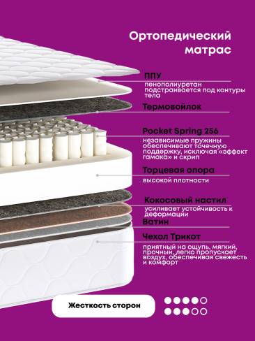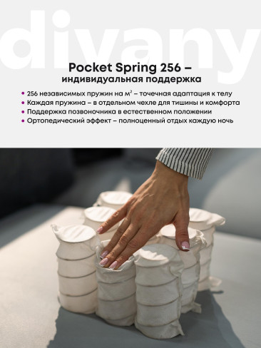 Самым оптимальным решением для матраса является пружинный блок Pocket Spring 256 пружин на квадратный метр, каждая пружина которого размещена в отдельном чехле из нетканого материала. Система Pocket Spring 256 обеспечивает полноценный сон и отдых, позволяет принять позвоночнику и мышцам комфортное положение и относится к серии ортопедических.Ортопедические матрасы обеспечивают оптимальную настройку на индивидуальные особенности вашего тела.