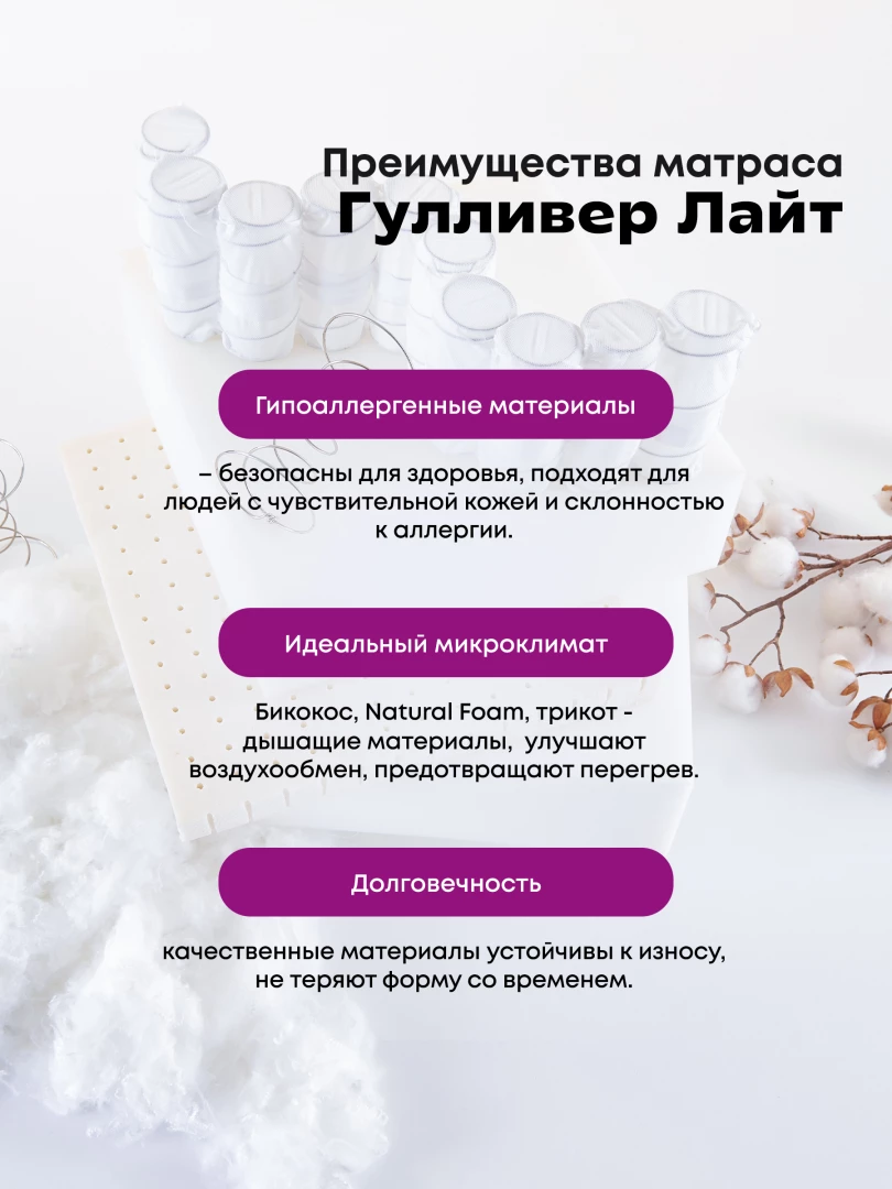 Матрас на основе блока независимых пружин «Pocket spring 250» Матрас « Гулливер Лайт» имеет разную жесткость сторон. Это очень удобно: если вам нужно изменить жесткость матраса, достаточно просто перевернуть его. Экопена принимает контур тела человека и обеспечивает высокие анатомические свойства спального места. Упругий и эластичный наполнитель пропускает воздух, не накапливает пыль и аллергены. С более жесткой стороны матрас дополнительно усилен слоем БИ-кокоса. Защитой от трения материалов служит термовойлок. Войлок проложен между пружинным основанием и наполнителями из бикокоса и ППУ. Высота матраса – 18см, максимальный вес на спальное место – 110 кг. Возможен заказ любого нестандартного размера.