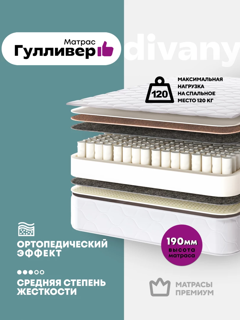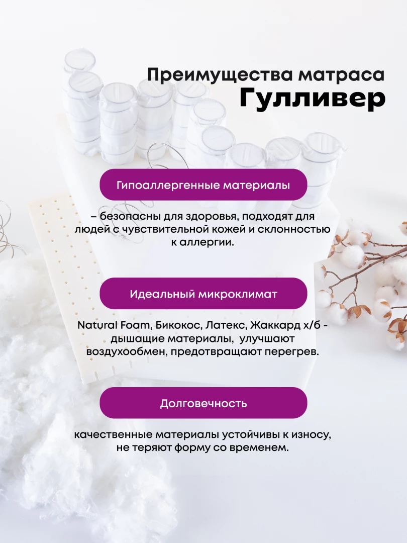 Подобрать матрас «под себя» бывает не так-то просто. Чтобы понять, какая степень жесткости матраса подходит вам лучше всего, иногда необходимо провести на нем несколько ночей. К сожалению, в магазине это сделать никто не позволит, остается один вариант: купить кокосовый матрас с разной жесткостью сторон (ассиметричный). Одна из них обязательно подойдет по всем параметрам. Гулливер – ортопедический упругий матрас от «Березки», жесткость которому придает кокосовое волокно, способное даже после значительных нагрузок восстанавливать изначальную форму. Внешний вид матраса улучшен хлопковой жаккардовой тканью и объемной стежкой. Роль наполнителя с одной стороны отдана натуральному латексу (средняя жесткость), с другой – латексированному кокосовому волокну (повышенная степень жесткости). Разная жесткость поверхностей улучшает практические качества изделия.