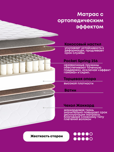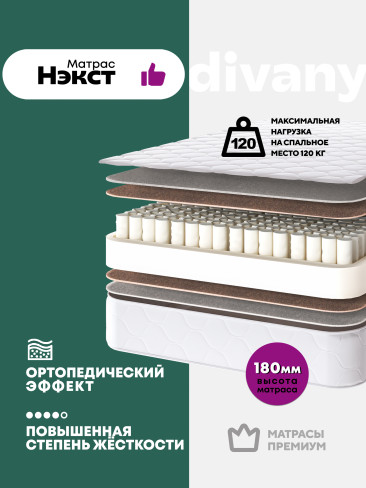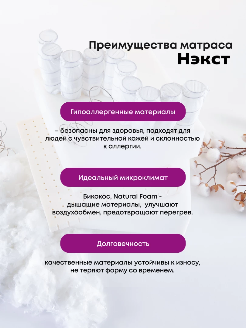 Неудобное положение во время сна может привести к нарушению осанки, к болям в спине и дискомфорту в мышцах. Чтобы этого не произошло, необходимо выбирать модели ортопедических матрасов, позволяющие полностью расслабиться и обеспечивающие здоровый сон. К таким матрасам принадлежит ортопедический матрас «Нэкст», в основе которого лежит наполнитель БИ-кокос, состоящий наполовину из кокоса и нетканого волокна. Он обеспечивает матрасу высокую степень жесткости и хороший ортопедический эффект. Рекомендуется людям, которые предпочитают жесткие поверхности мягким основаниям.Кокос как природный материал уникален: он имеет множество полезных свойств. Он не гниет при воздействии на него влаги, как некоторые другие натуральные материалы, в нем не размножаются бактерии и, что самое главное, он не вызывает аллергических реакций. Последний факт дает возможность использовать его людям, чувствительным к аллергенам, а также детям, в том числе младенцам, – для более здорового и крепкого сна. Начинка матраса включает в себя пружинный блок независимых пружин «Pocket spring 250», в котором каждая пружинка при нагрузке «работает» индивидуально, не беспокоя своих соседок, что позволяет телу во время сна принять наиболее комфортное положение.