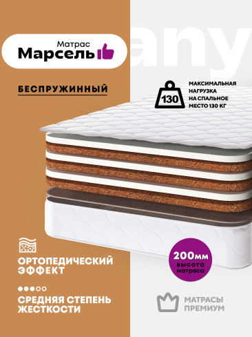 Беспружинный кокосовый матрас, состоящий из нескольких слоев БИ-кокоса и ППУ. Слои наполнителей чередуются друг с другом, придавая матрасу комфортную степень жесткости и упругости. Высота каждого слоя составляет 3 см. Особенность таких материалов, как пенополиуретан и жесткая кокосовая койра заключается в том, что они очень быстро восстанавливают форму даже после высоких нагрузок, не вызывают раздражений и аллергии, имеют длительный срок службы.Ортопедический матрас без пружин «Марсель» имеет разную жесткость сторон: одна сторона со средней степенью жесткости, вторая – с высокой степенью жесткости. В зависимости от состояния здоровья и самочувствия, для ночного отдыха можно удобно расположиться либо на той, либо на другой стороне. Для улучшения эксплуатационных качеств матрас оснащен ручками, расположенными по бокам, а также вентиляционными отверстиями, которые не дают влаге задерживаться внутри его слоев. Вентилирование матраса позволяет создать комфортный температурный режим во время сна.