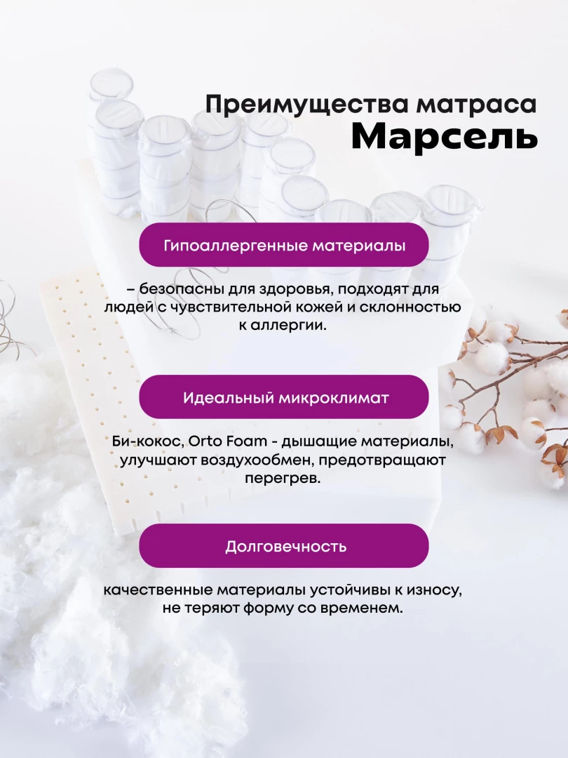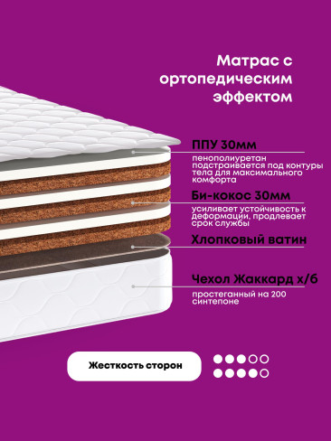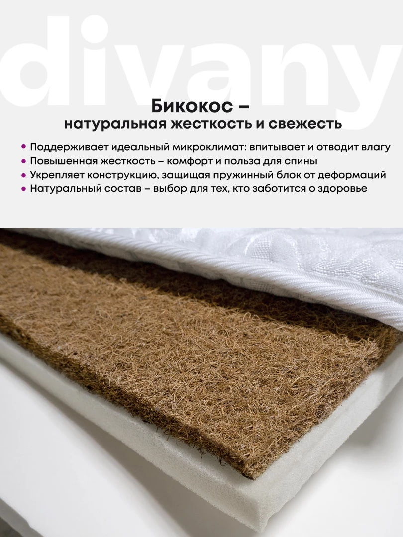 Бикокос — материал нового поколения. Благодаря высокой воздухопроницаемости и гигроскопичности Бикокос поддерживает воздухо и влагообмен, способствуя поддержанию микроклимата. Служит не только для коррекции жесткости, но и для предупреждения деформации пружинного блока.