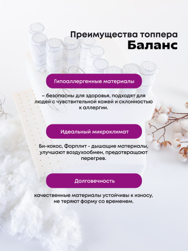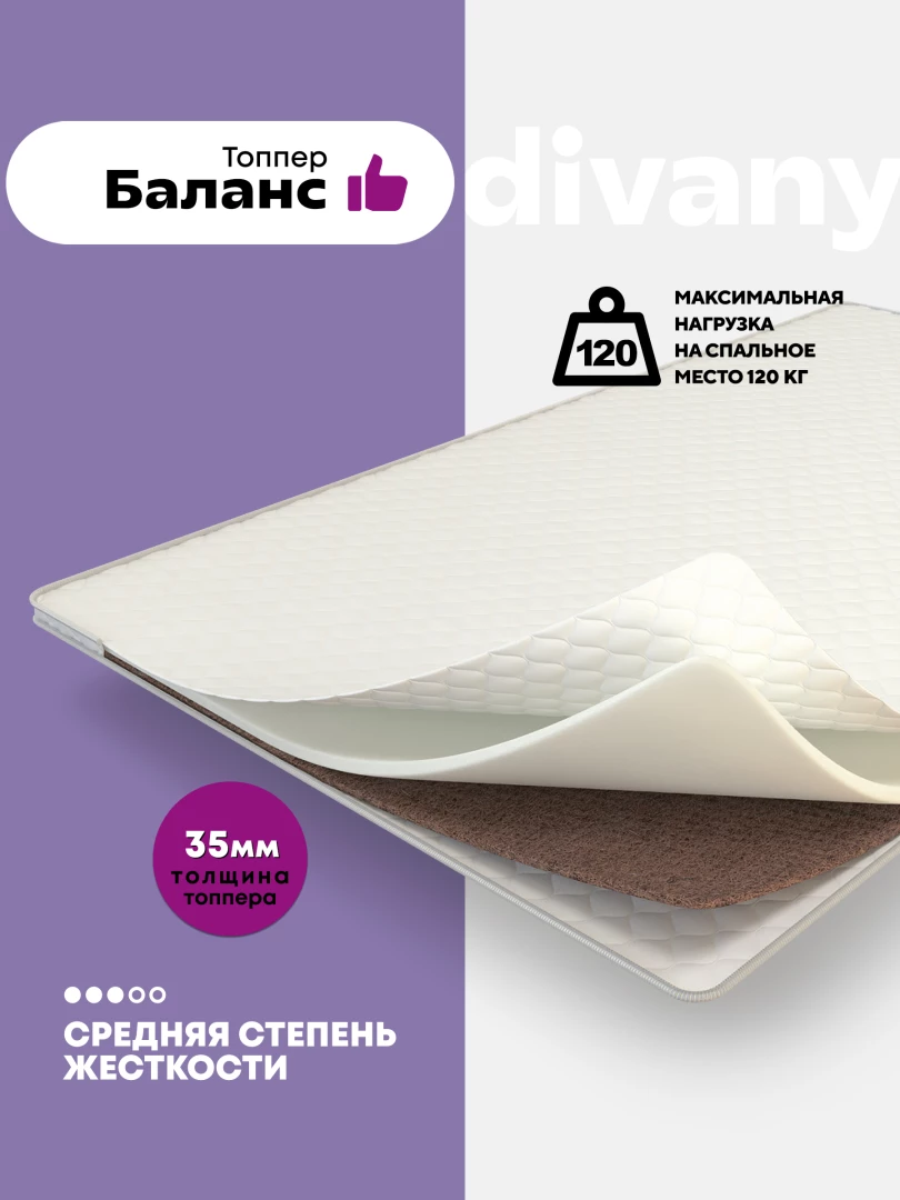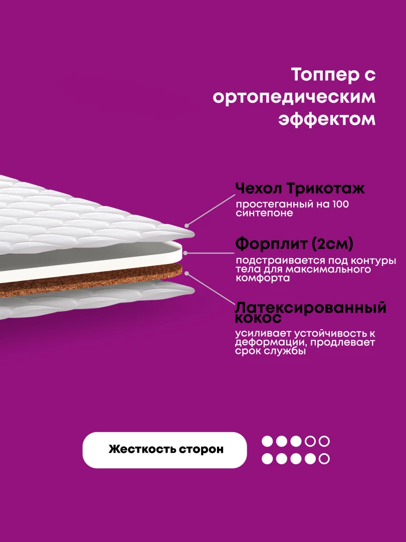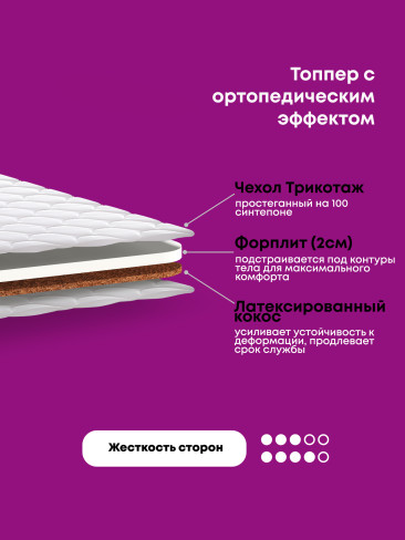 Топпер- тонкий, беспружинный, ортопедический матрас, предназначенный для выравнивания поверхности продавленного дивана, матраса, тем самым обеспечивает поддержку для позвоночника, улучшает качество сна, надежно защищает матрас или диван от пыли и грязи. В состав данного топпера входят: латексированный кокос — слой кокосовой койры, пропитанный латексом, натуральным, упругим, высокоэластичным материалом, придающим необходимую жесткость, и форплит — нетканный материал из полиэфирного волокна, обладающего гипоаллергенным свойством. Можно использовать положив его прямо на пол.