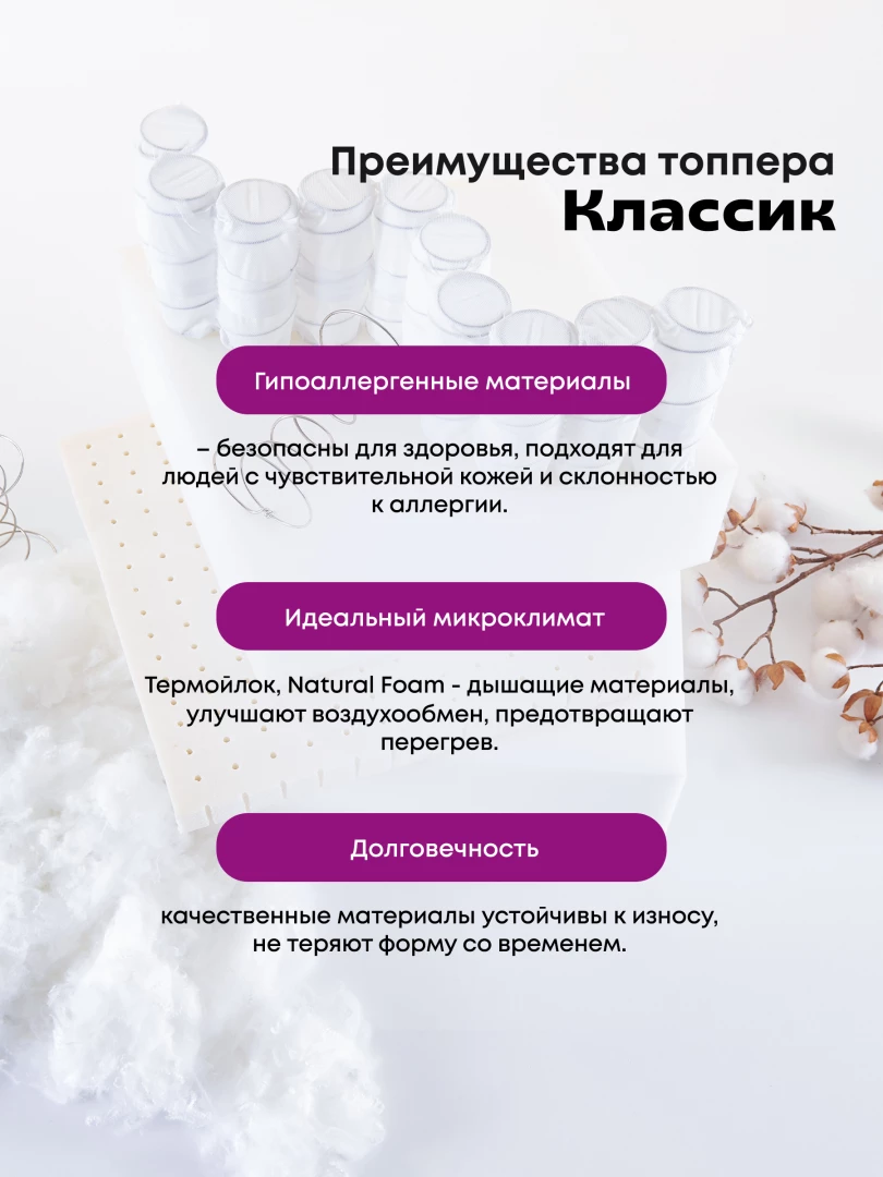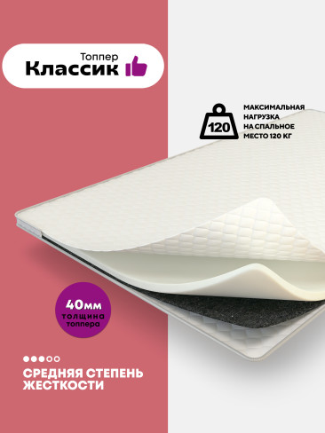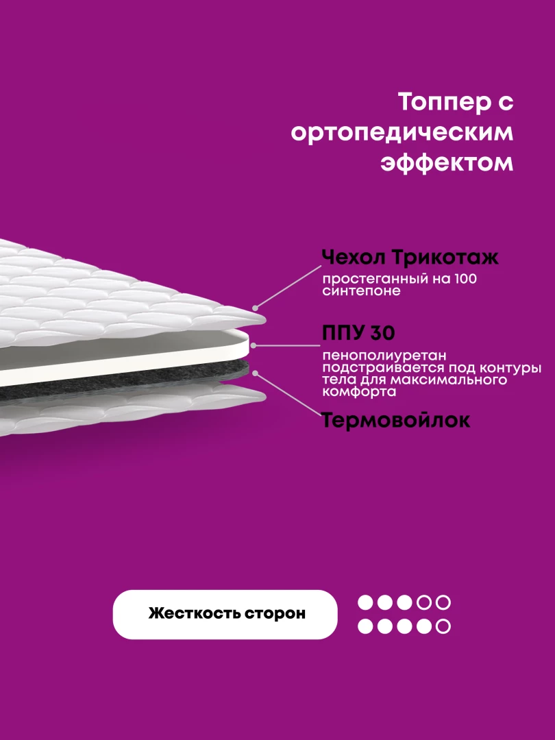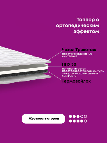 Топпер — тонкий, беспружинный, ортопедический матрас, предназначенный для выравнивая поверхности продавленного дивана, матраса, тем самым обеспечивает поддержку для позвоночника, улучшает качество сна, надежно защищает матрас или диван от пыли и грязи. Можно использовать положив прямо на пол. В состав данного топпера входит термовойлок — термопрессованный материал, состоящий из смеси синтетических, хлопковых и шерстяных волокон, безопасный для аллергиков. Положительные качества данного топпера усилены используемым в нем слоя ППУ, искусственным материалом ячеистого типа.