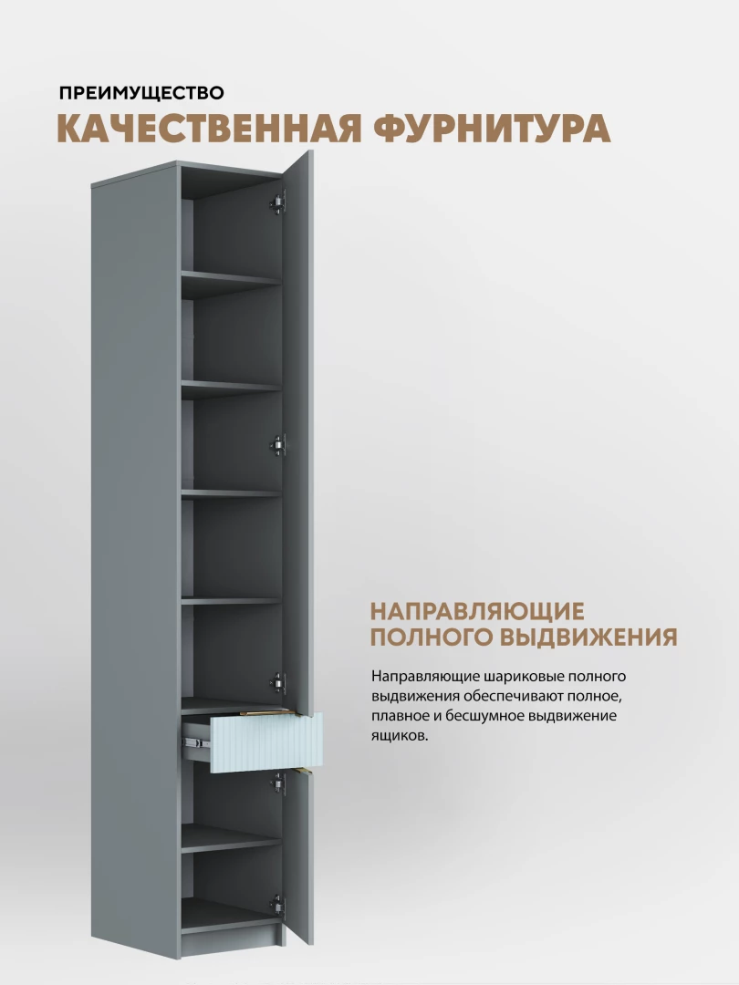 Описание конструкции «ДЖЕРСИ Шкаф ШК-001»:  ДЖЕРСИ Шкаф ШК-001 выпускается в одном сочетании цветов корпуса и фасада: - Корпус - Шиншилла Серая Фасад МДФ - матовая Скай TS 841-SFT (GREENWOOD)  В ДЖЕРСИ Шкафу ШК-001 1 ящик, оснащенный направляющей полного выдвижения – шариковые 450 мм (35мм) нагрузка на пару направляющих – 10 кг с учетов веса ящика. Фасад ящика МДФ в пленке ПВХ, с фрезеровкой. Створки ЛДСП в кромке 2 мм. Полезный объём ящика ДЖЕРСИ Шкафа ШК-001 Д.312 х В.106 х Г.418 мм. Фасады шкафа накладные, открывание при помощи ручек. Задняя стенка – ЛХДФ белого цвета. Верхняя часть шкафа полками поделена на 5 равных отсеков Д.368 х В.308 х Г.490 мм, нижняя часть полкой разделена на 2 равных отсека Д.368 х В.230 х Г.490 мм. Нагрузка на полки 5 кг равномерно распределенной массы.