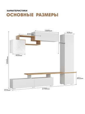 БОХО Гостиная НМ-001 состоит из трёх независимых модулей: навесного шкафа с 2-мя глухими фасадами, тумбы навесной и открытой полки.