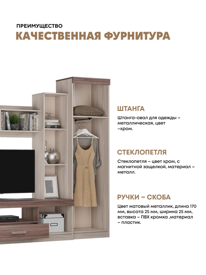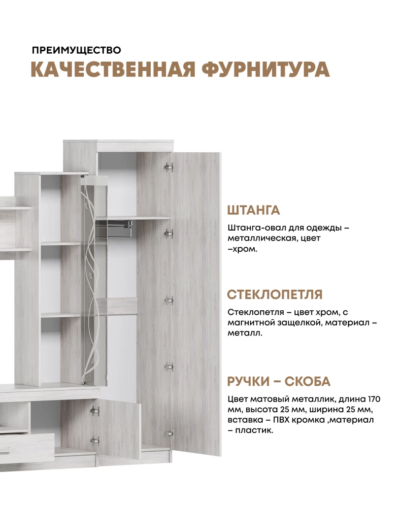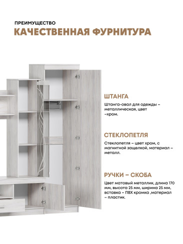 Петли позволяют крепить фасады на корпус шкафов. Качество используемой фурнитуры — гарантия долгой службы изделия. Петли и фурнитура нашей мебели обладают высоким запасом прочности и выдерживают значительные нагрузки, на протяжении всего срока эксплуатации.