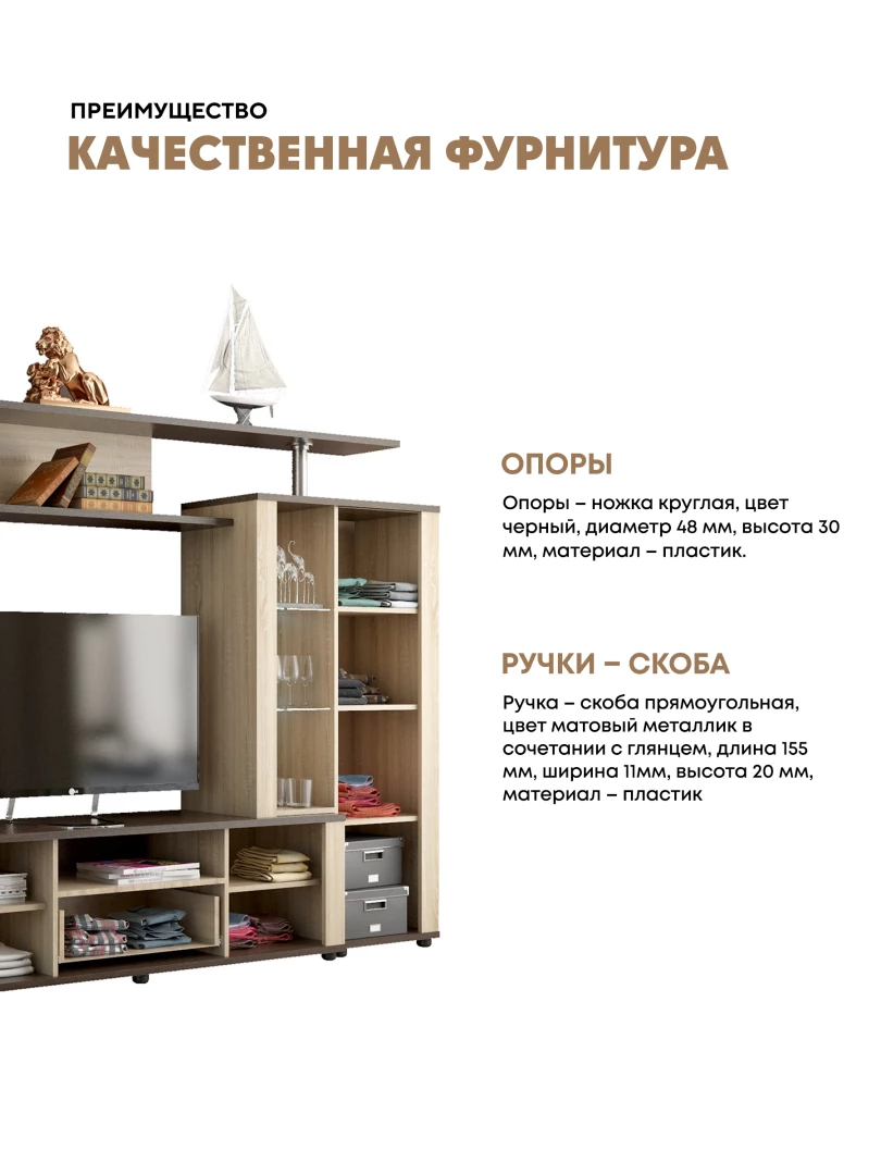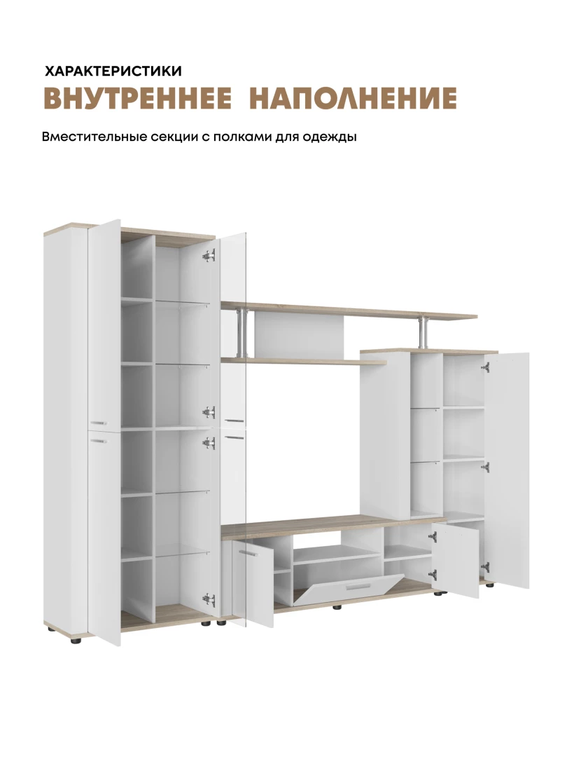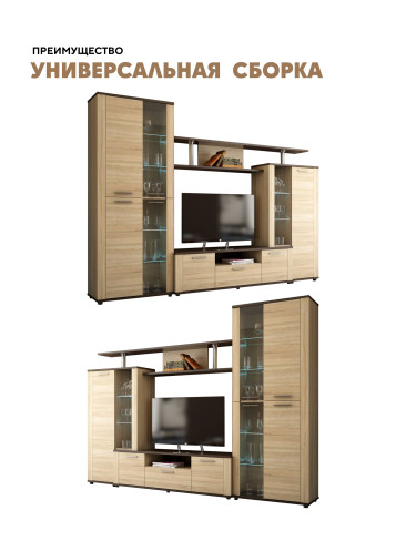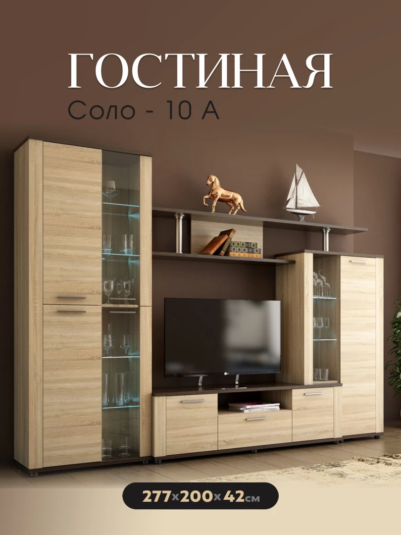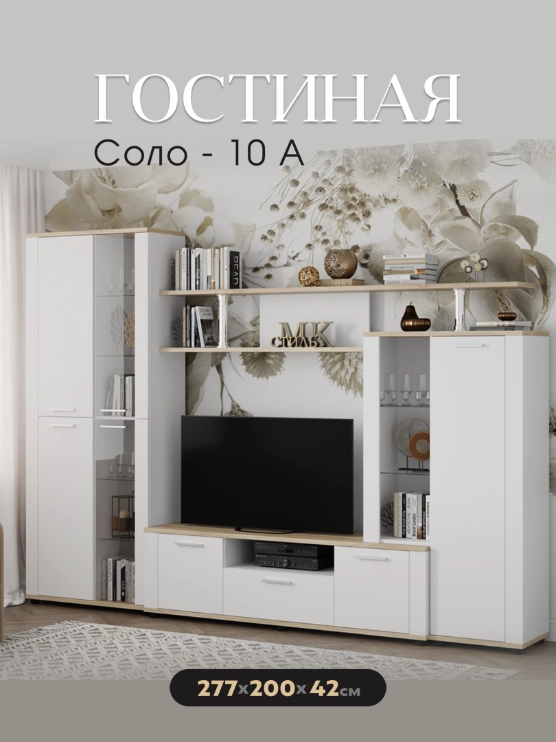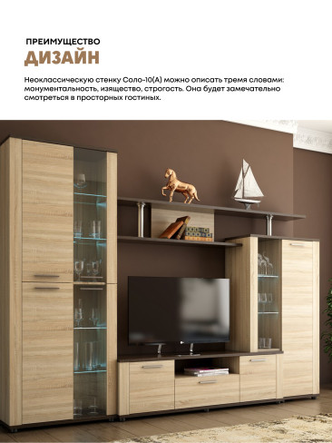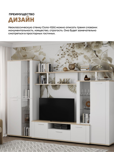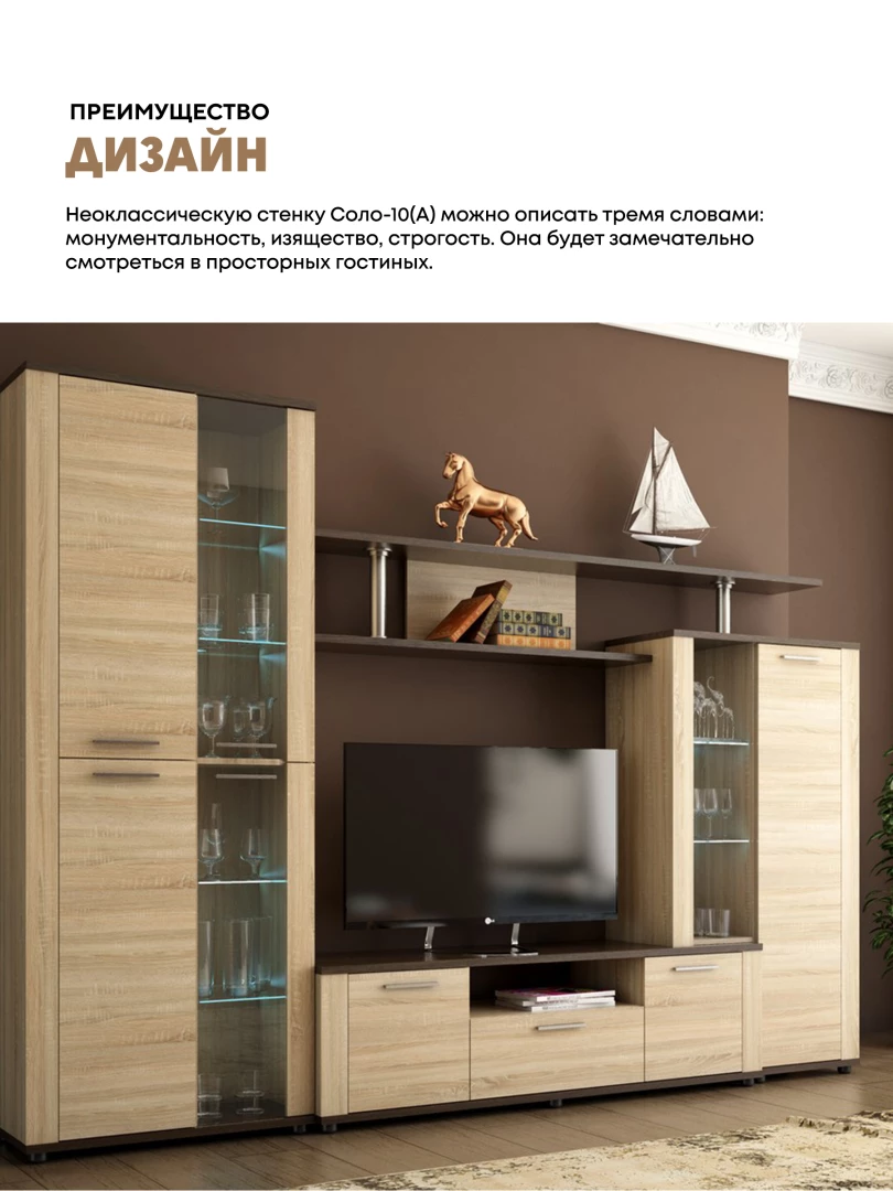 Неоклассическую стенку Соло-10(А) можно описать тремя словами: монументальность, изящество, строгость. Она будет замечательно смотреться в просторных гостиных.