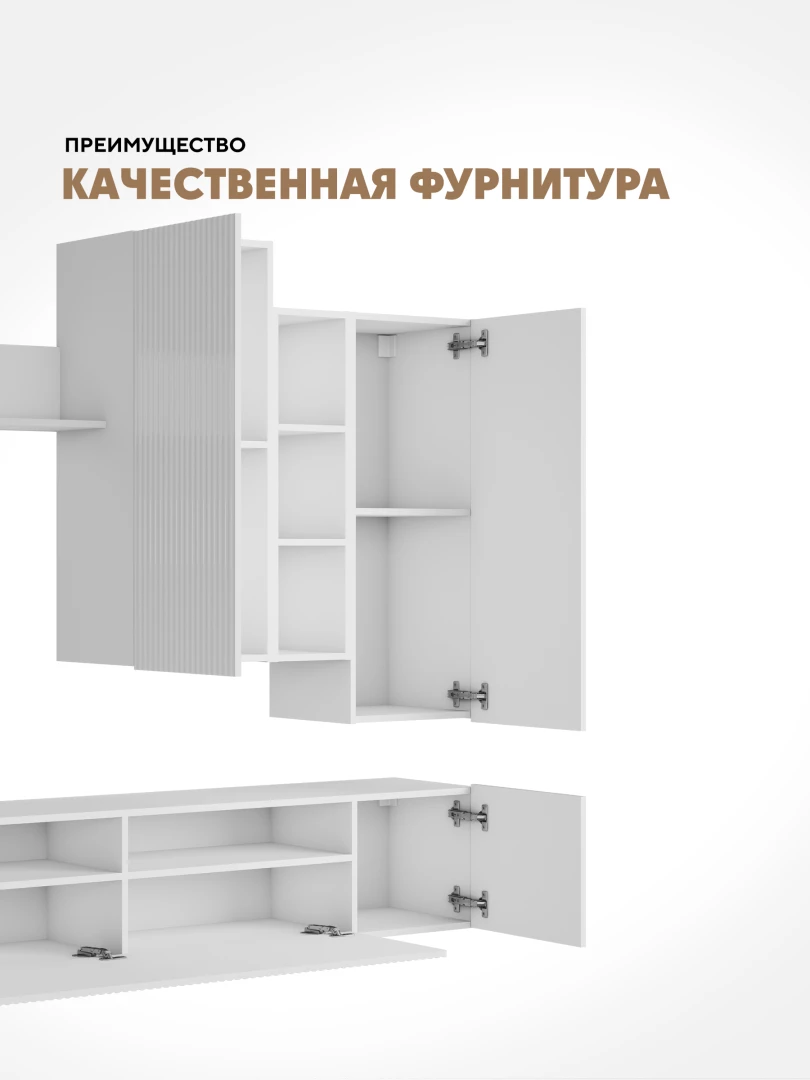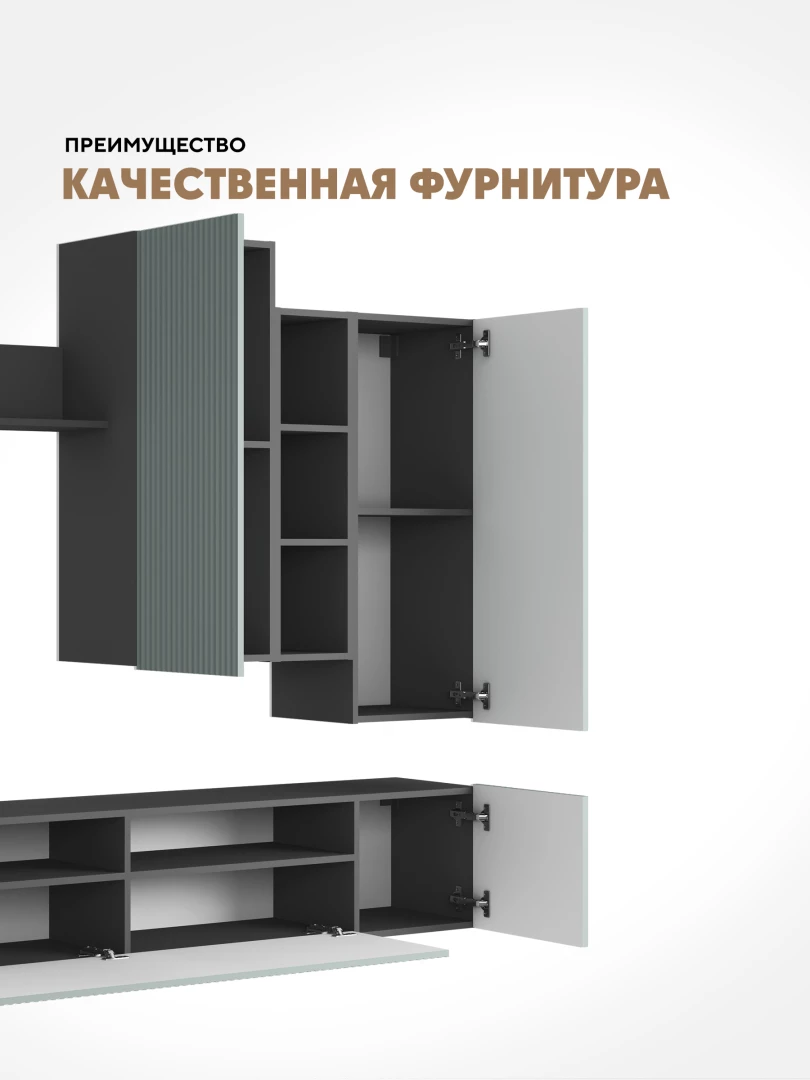 •    Компактный размер стенки и ее многофункциональное наполнение позволяют расходовать ограниченное пространство комнаты максимально эффективно