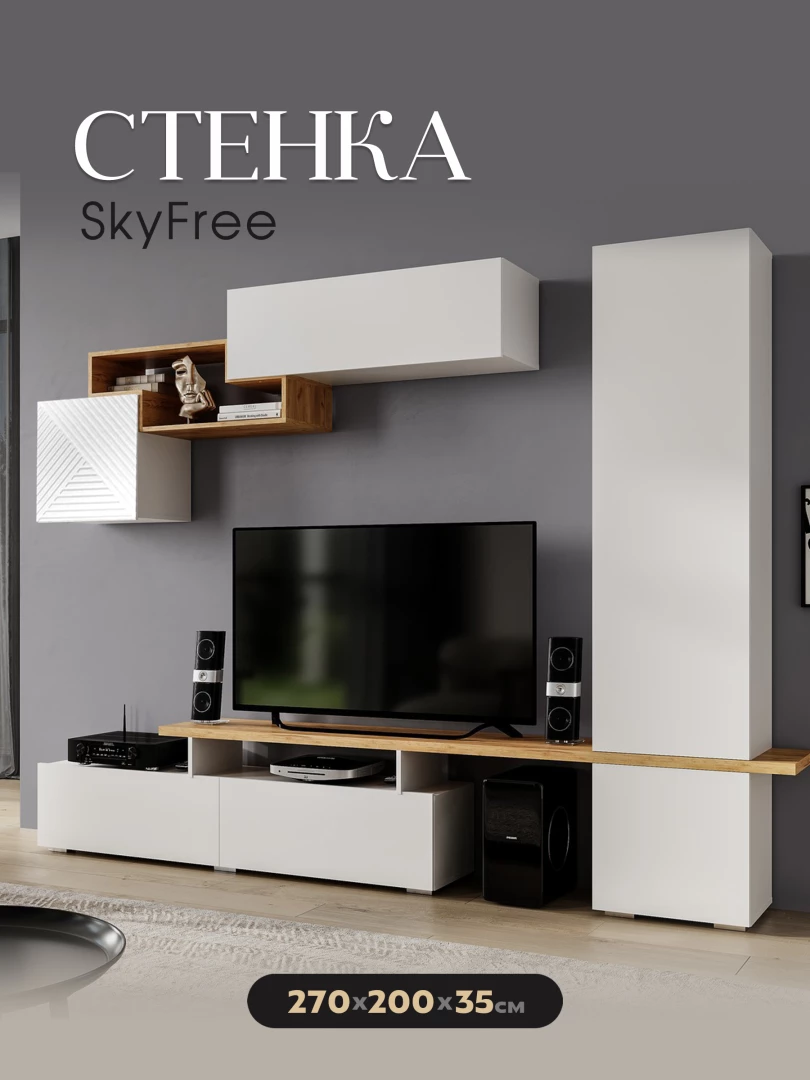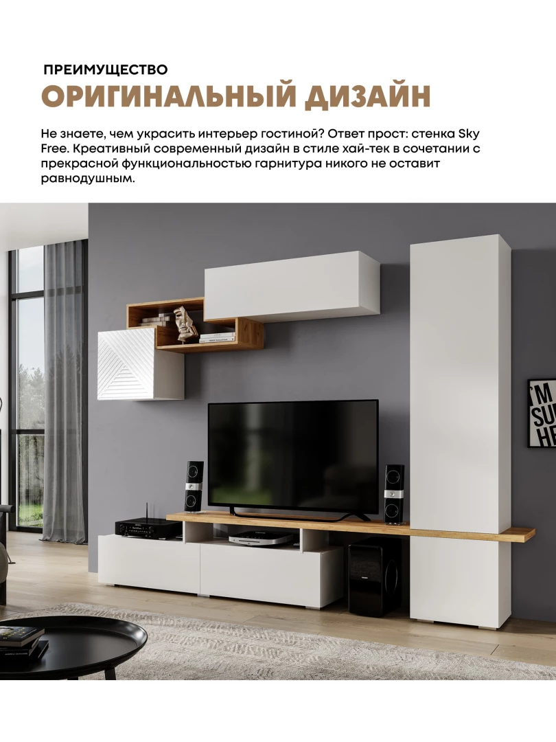 Не знаете, чем украсить интерьер гостиной? Ответ прост: стенка Sky Free. Креативный современный дизайн в стиле хай-тек в сочетании с прекрасной функциональностью гарнитура никого не оставит равнодушным.