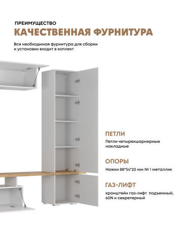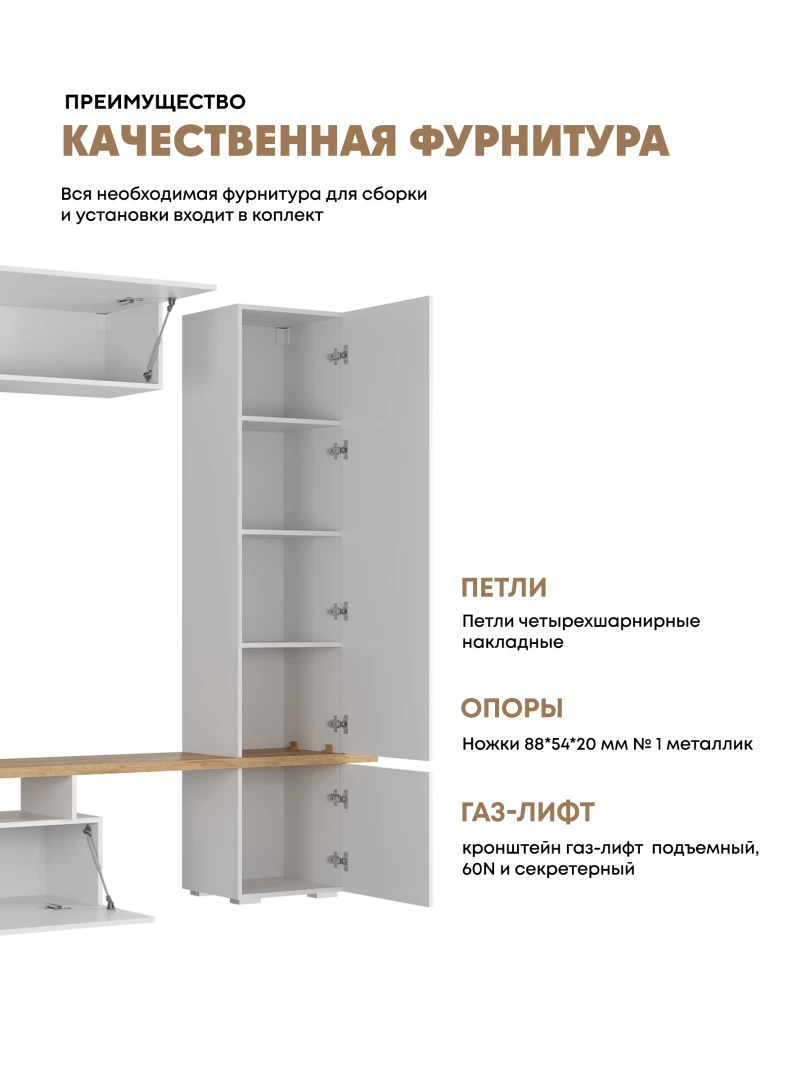 Петли позволяют крепить фасады на корпус шкафов. Качество используемой фурнитуры — гарантия долгой службы изделия. Петли и фурнитура нашей мебели обладают высоким запасом прочности и выдерживают значительные нагрузки, на протяжении всего срока эксплуатации.
