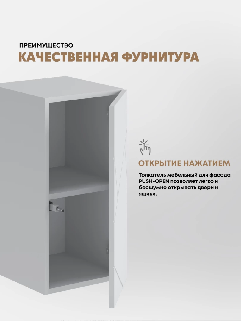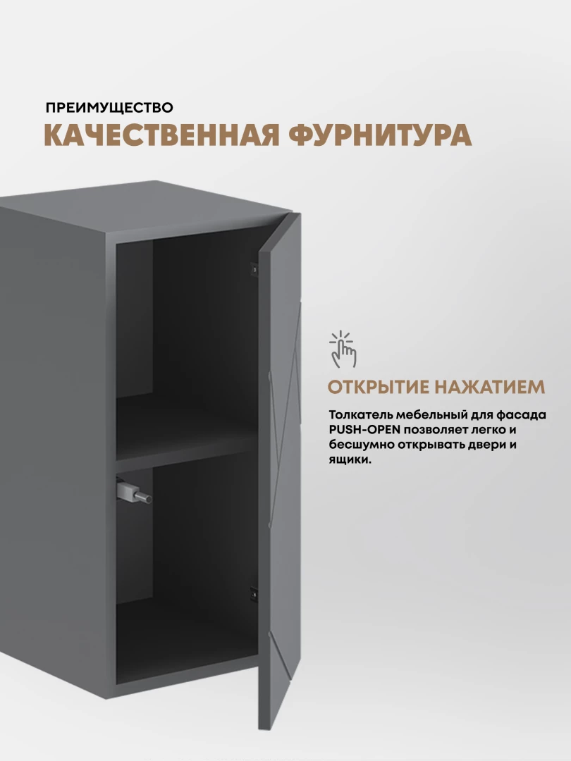 •    Створки фасадов выполнены без ручек, происходит при помощи отталкивателя путем нажатия на фасад (система PUSH-TO-OPEN)