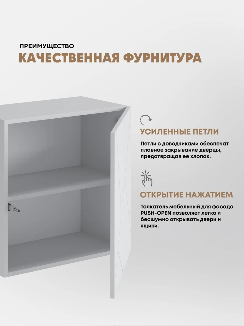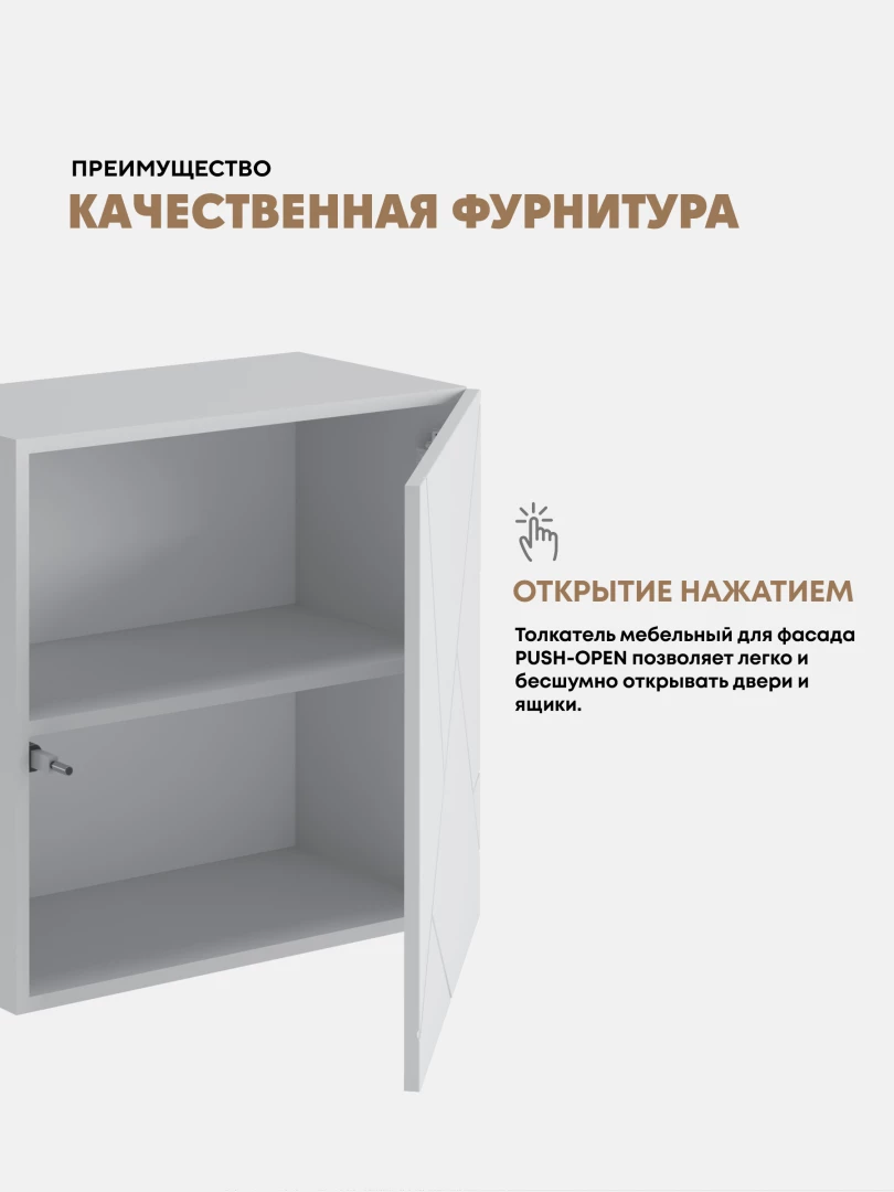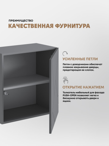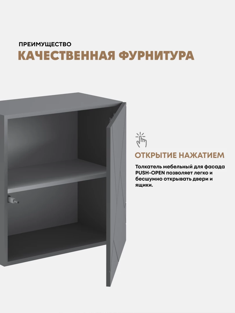 •    Створки фасадов выполнены без ручек, происходит при помощи отталкивателя путем нажатия на фасад (система PUSH-TO-OPEN)