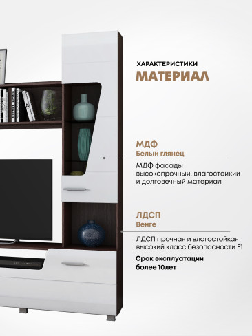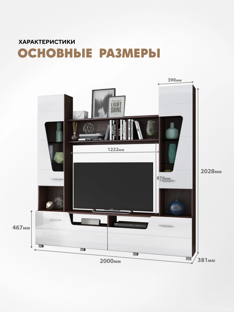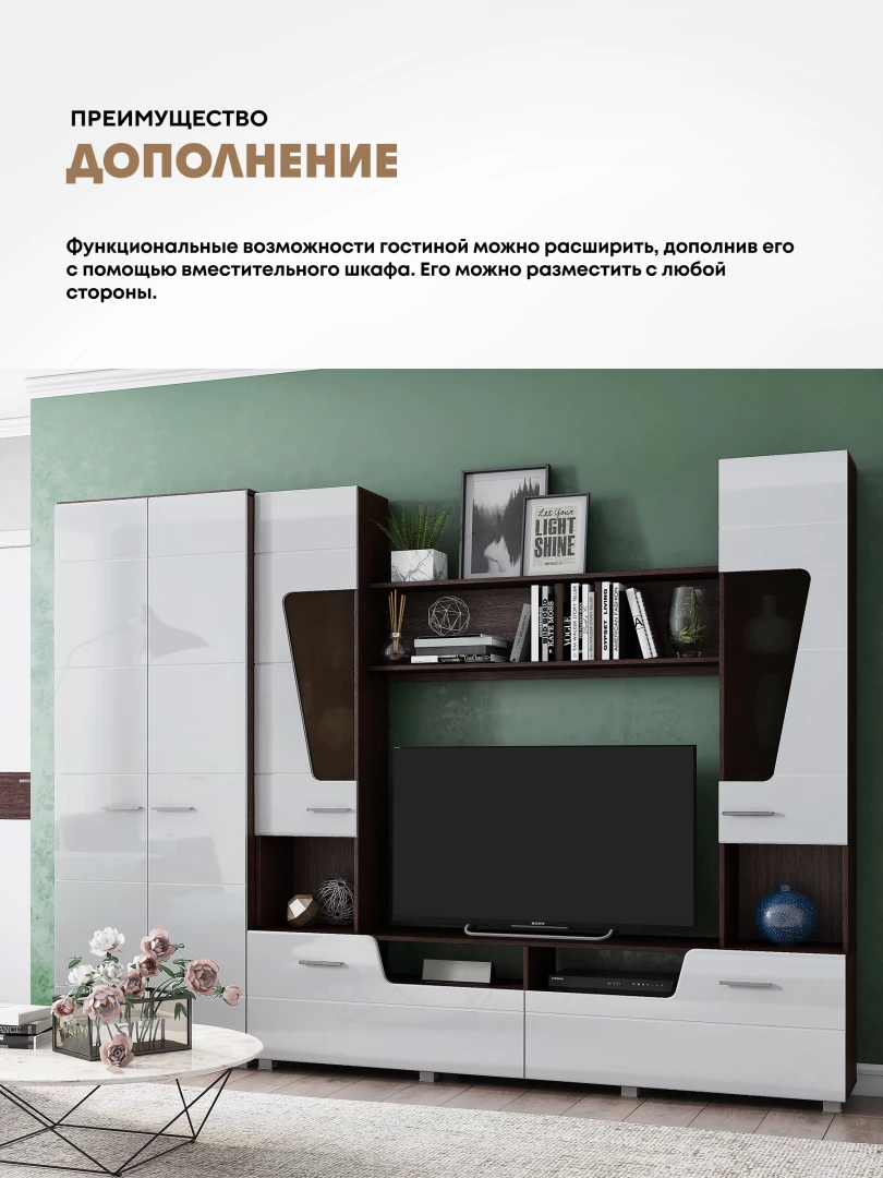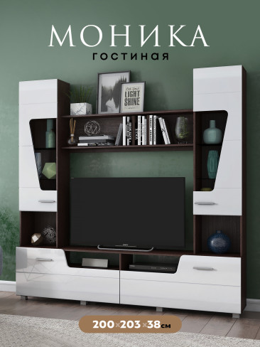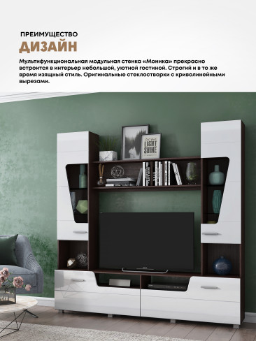 Мультифункциональная модульная стенка «Моника» прекрасно встроится в интерьер небольшой, уютной гостиной. Функциональные возможности базового модуля можно расширить, дополнив его с помощью вместительного шкафа по вашему выбору.