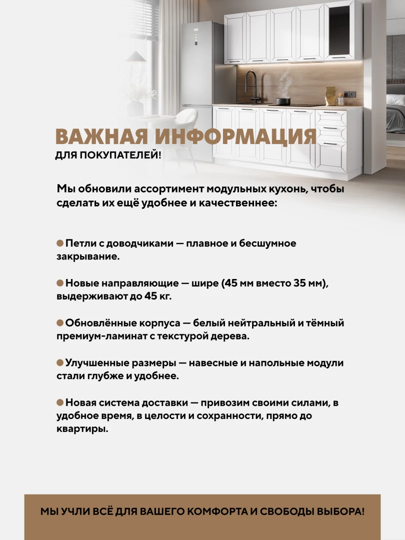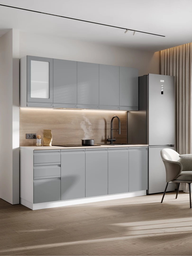 Корпус и фасады кухни представлены в актуальных трендовых цветах, что позволит легко сочетать их с другой мебелью.
