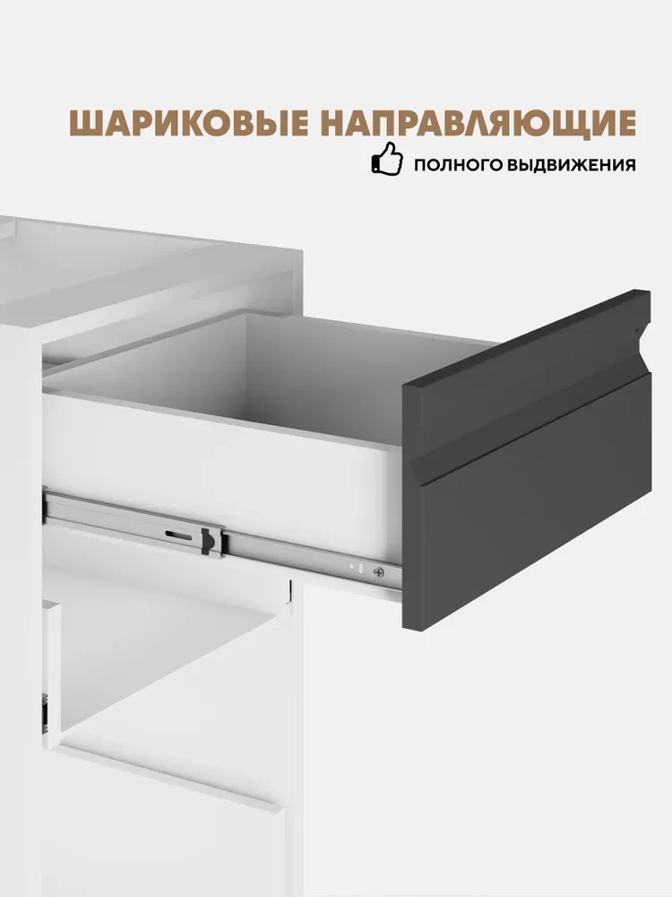 Преимуществам данной кухни является качественная фурнитура. Направляющие шариковые полного выдвижения обеспечивают полное, плавное и бесшумное выдвижение ящиков, а петли с доводчиками обеспечат плавное закрывание дверцы, предотвращая ее хлопок.