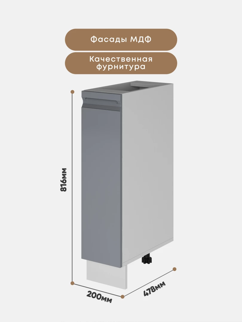 Фасады кухни выполнены из МДФ, что придает мебели дорогой и презентабельный вид и не оказывает отрицательного действия на здоровье человека в процессе эксплуатации.