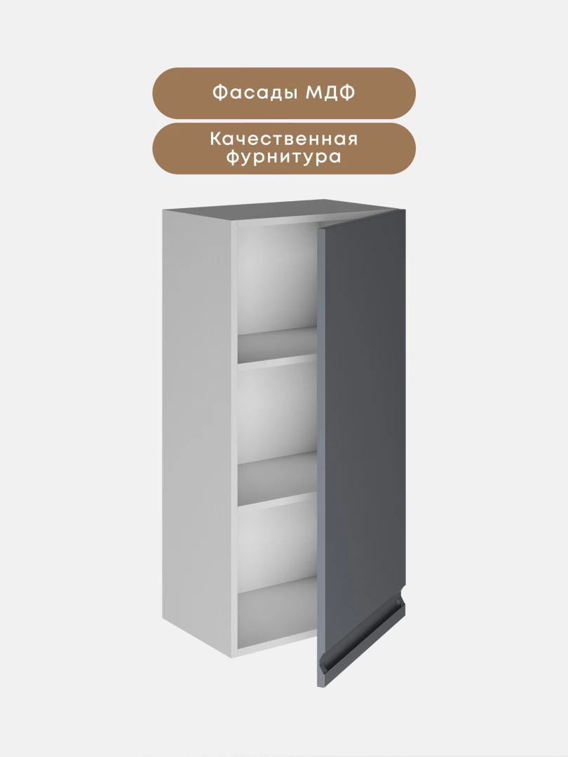 Фасады кухни выполнены из МДФ, что придает мебели дорогой и презентабельный вид и не оказывает отрицательного действия на здоровье человека в процессе эксплуатации.