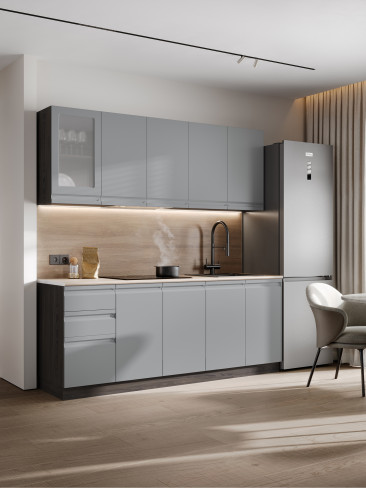 Корпус и фасады кухни представлены в актуальных трендовых цветах, что позволит легко сочетать их с другой мебелью.