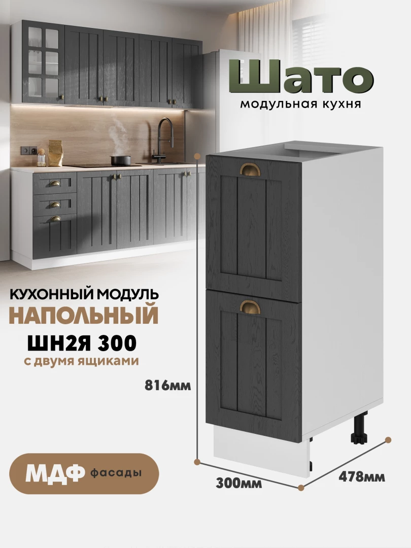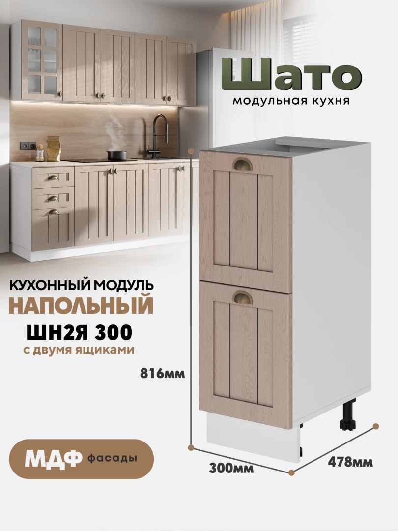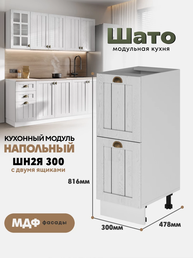 Кухонный напольный модуль ШН2Я 300 с 2-мя ящиками «Шато» Белый — это компактный и практичный элемент коллекции «Шато», выполненной в стиле «деревенского шика». Лаконичный дизайн и тёплый оттенок «Ликата» создают атмосферу уюта и гармонии, делая кухню максимально функциональной.