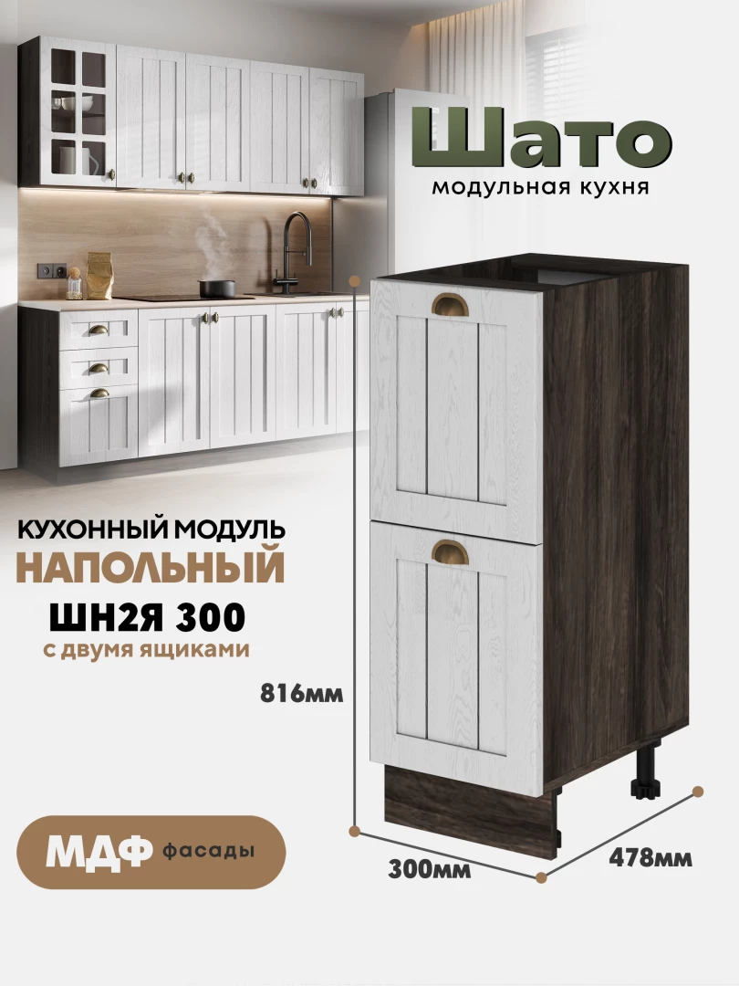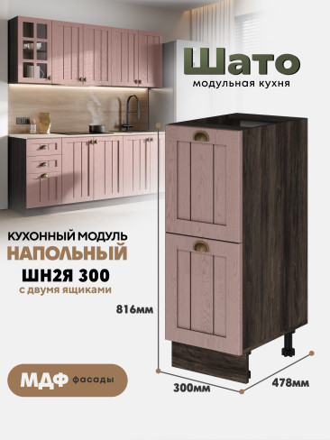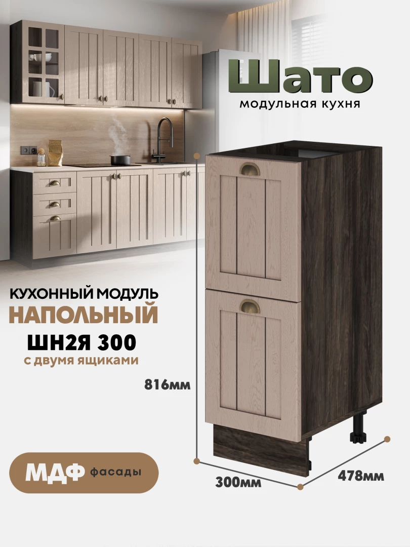 Кухонный напольный модуль ШН2Я 300 с 2-мя ящиками «Шато» Ликата — это компактный и практичный элемент коллекции «Шато», выполненной в стиле «деревенского шика». Лаконичный дизайн и тёплый оттенок «Ликата» создают атмосферу уюта и гармонии, делая кухню максимально функциональной.