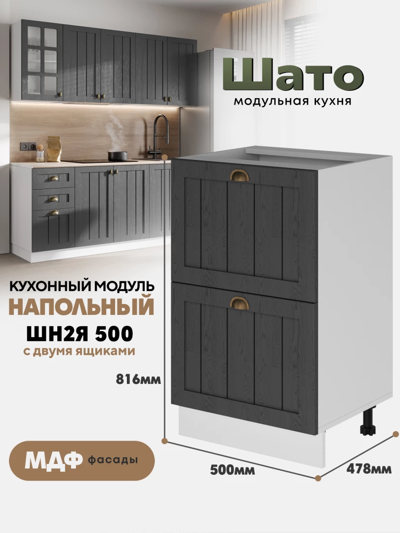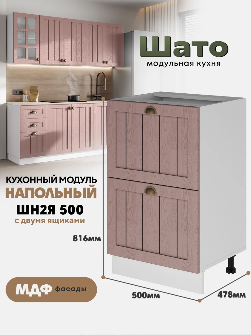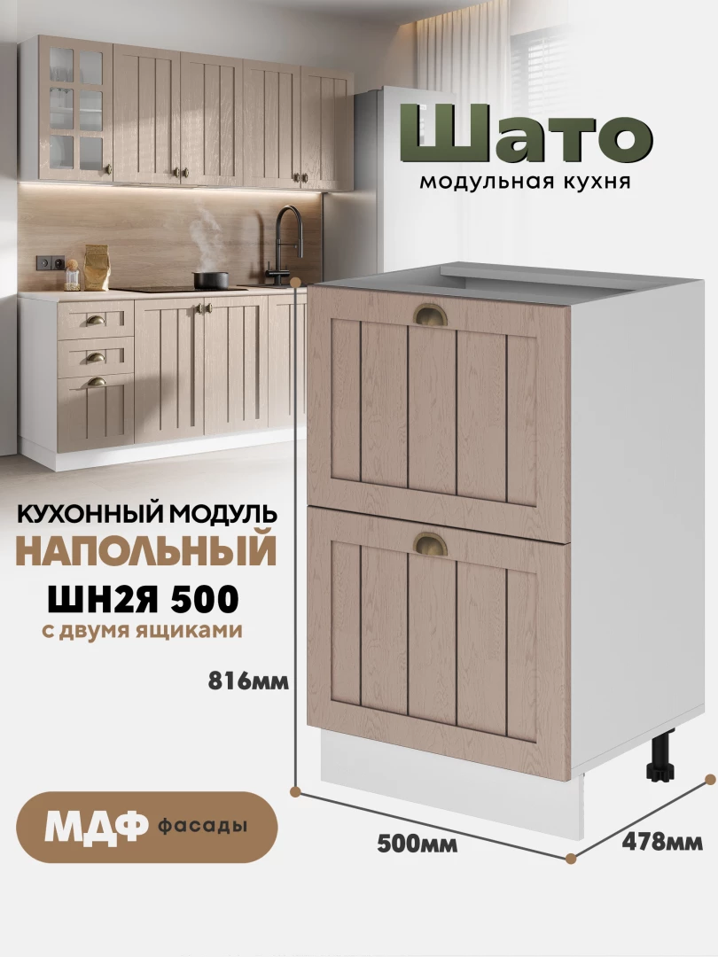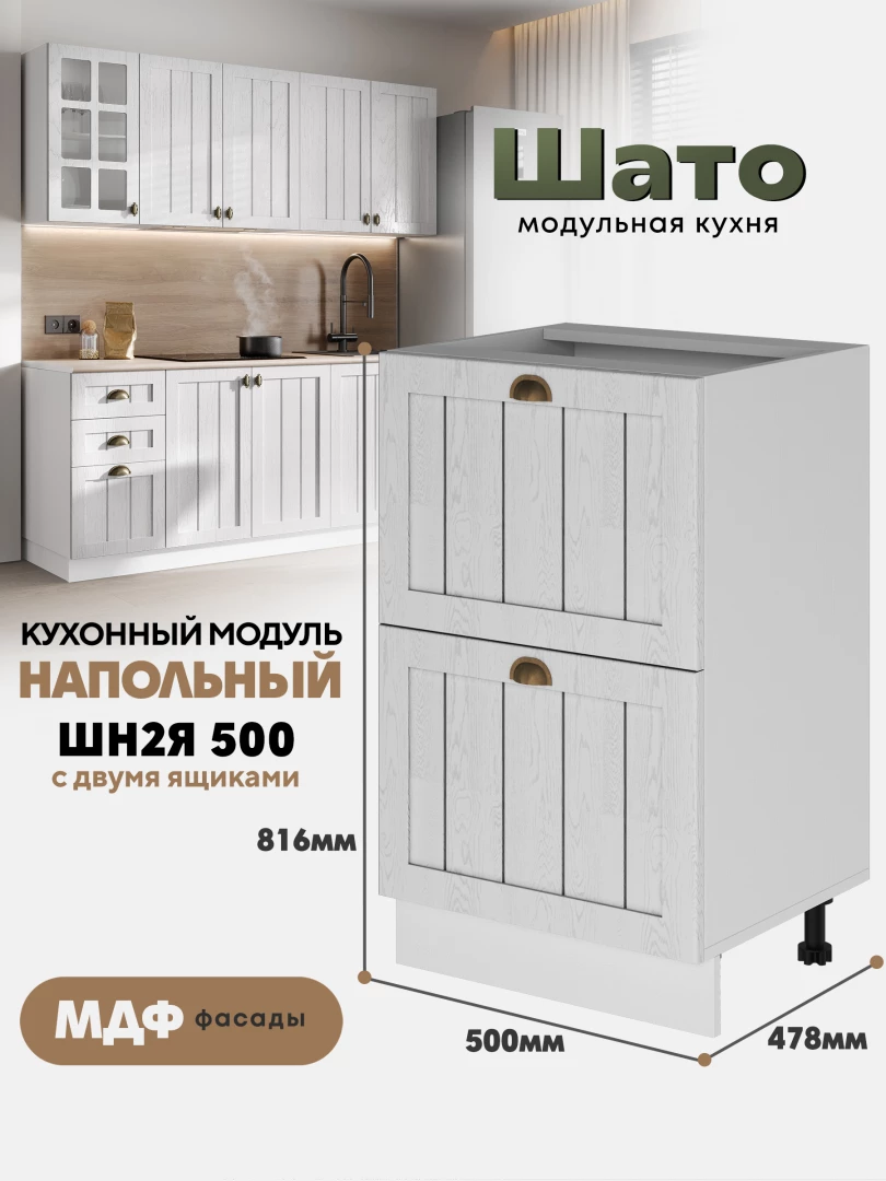 Кухонный напольный модуль ШН2Я 500 с 2-мя ящиками «Шато» Белый — это компактный и практичный элемент коллекции «Шато», выполненной в стиле «деревенского шика». Лаконичный дизайн и тёплый оттенок «Ликата» создают атмосферу уюта и гармонии, делая кухню максимально функциональной.