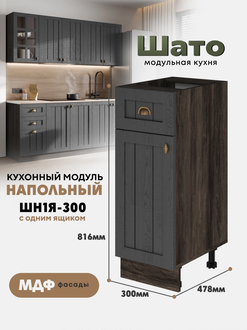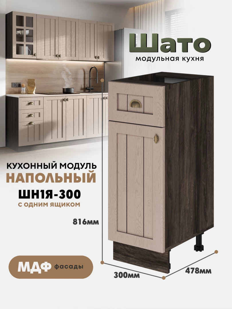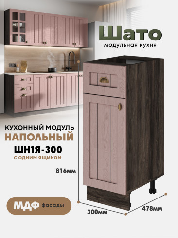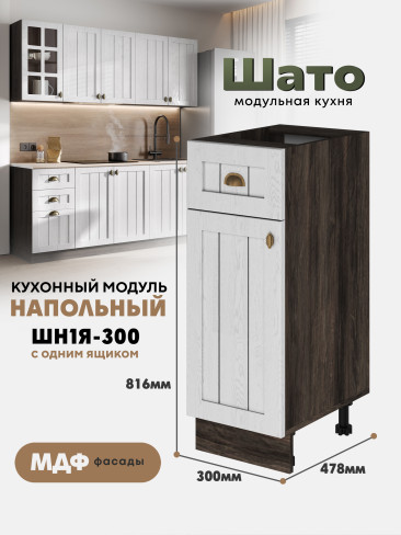Кухонный напольный модуль ШН1Я 300 с ящиком и дверкой «Шато» Ликата — это компактный и практичный элемент коллекции «Шато», выполненной в стиле «деревенского шика». Лаконичный дизайн и тёплый оттенок «Ликата» создают атмосферу уюта и гармонии, делая кухню максимально функциональной.