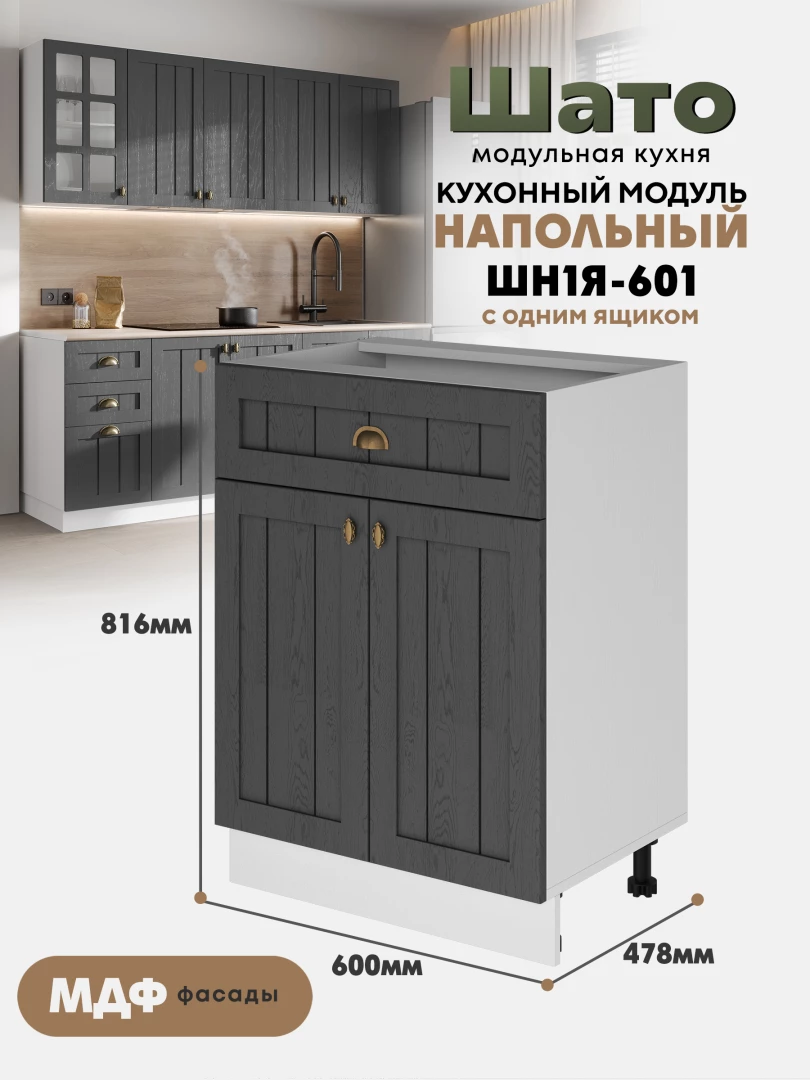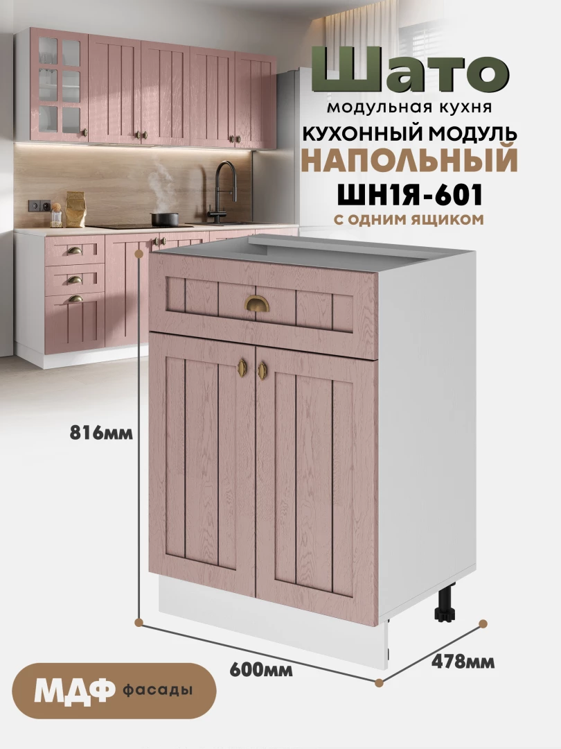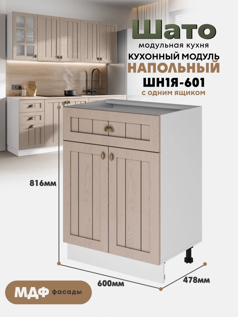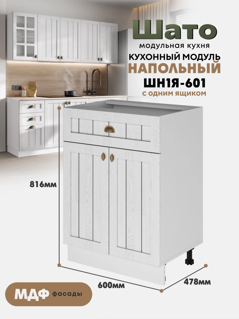 Кухонный напольный модуль ШН1Я 601 с ящиком и дверкой «Шато» Белый — это компактный и практичный элемент коллекции «Шато», выполненной в стиле «деревенского шика». Лаконичный дизайн и тёплый оттенок «Ликата» создают атмосферу уюта и гармонии, делая кухню максимально функциональной.