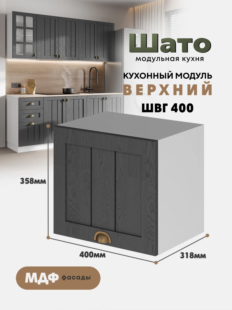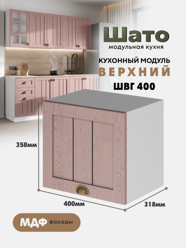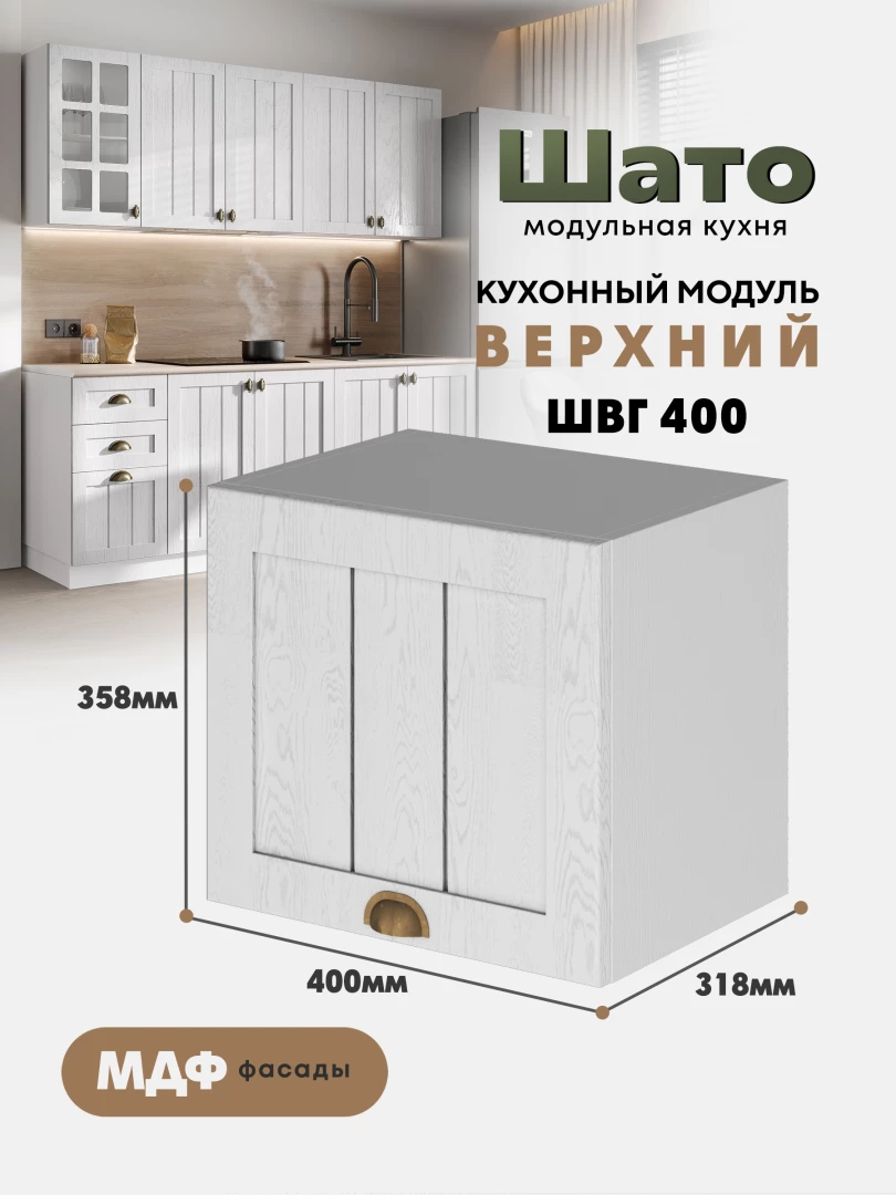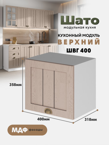Кухонный настенный модуль ШВГ 400 (антресоль) «Шато»  Белый  — это компактный и практичный элемент коллекции «Шато», выполненной в стиле «деревенского шика». Лаконичный дизайн с мягкими формами и тёплый оттенок «Ликата» придают кухне атмосферу уюта и гармонии.