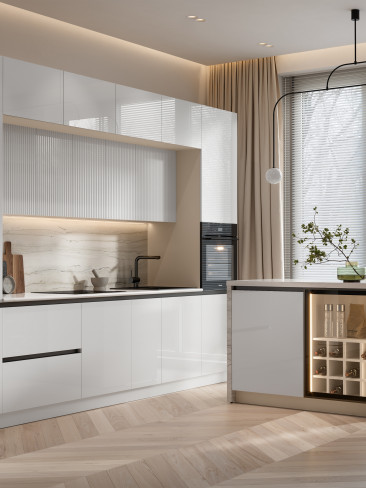 В данной коллекции используется система профилей Gola. У кухонь с профилем нет ручек: чтобы открыть ящик или шкаф, нужно просто потянуть за фасад. А профиль на корпусе необходим, чтобы создать за фасадом пространство для захвата рукой.