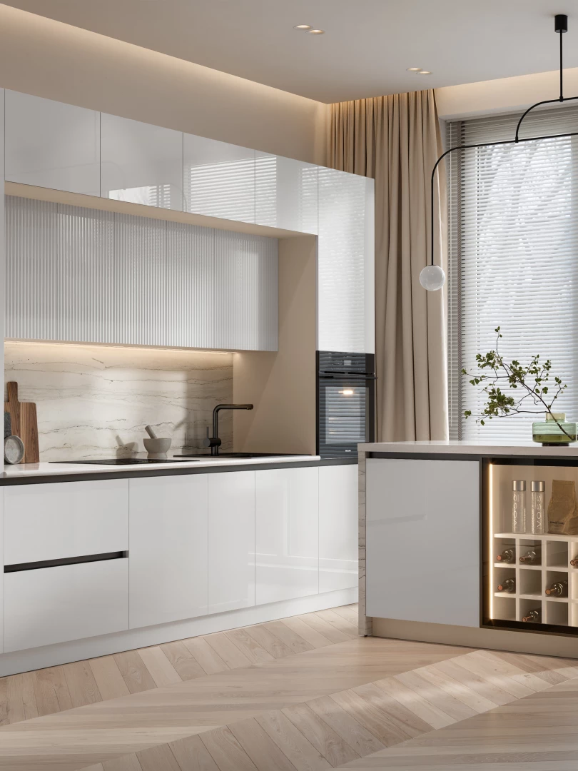 Фасады из МДФ выглядят дорого и благородно. Верхние рельефные фасады являются микротрендом, у которого есть все шансы задержаться в моде не на один сезон. Дизайн фасадов с вертикальными полосками меняет восприятие пространства – визуально раздвигает, добавляет воздушности.