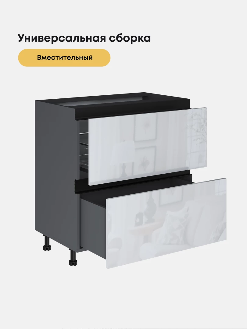 Ящики на направляющих скрытого монтажа обеспечивают полное, плавное и бесшумное выдвижение ящиков. Разнообразие актуальных расцветок фасада и корпуса поможет найти для себя комфортное решение для удачного сочетания с гостиной.