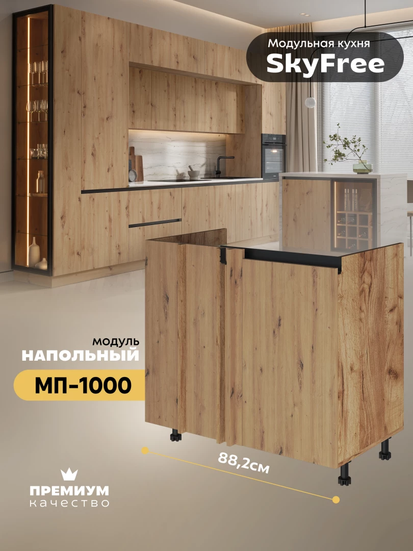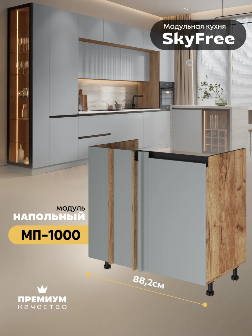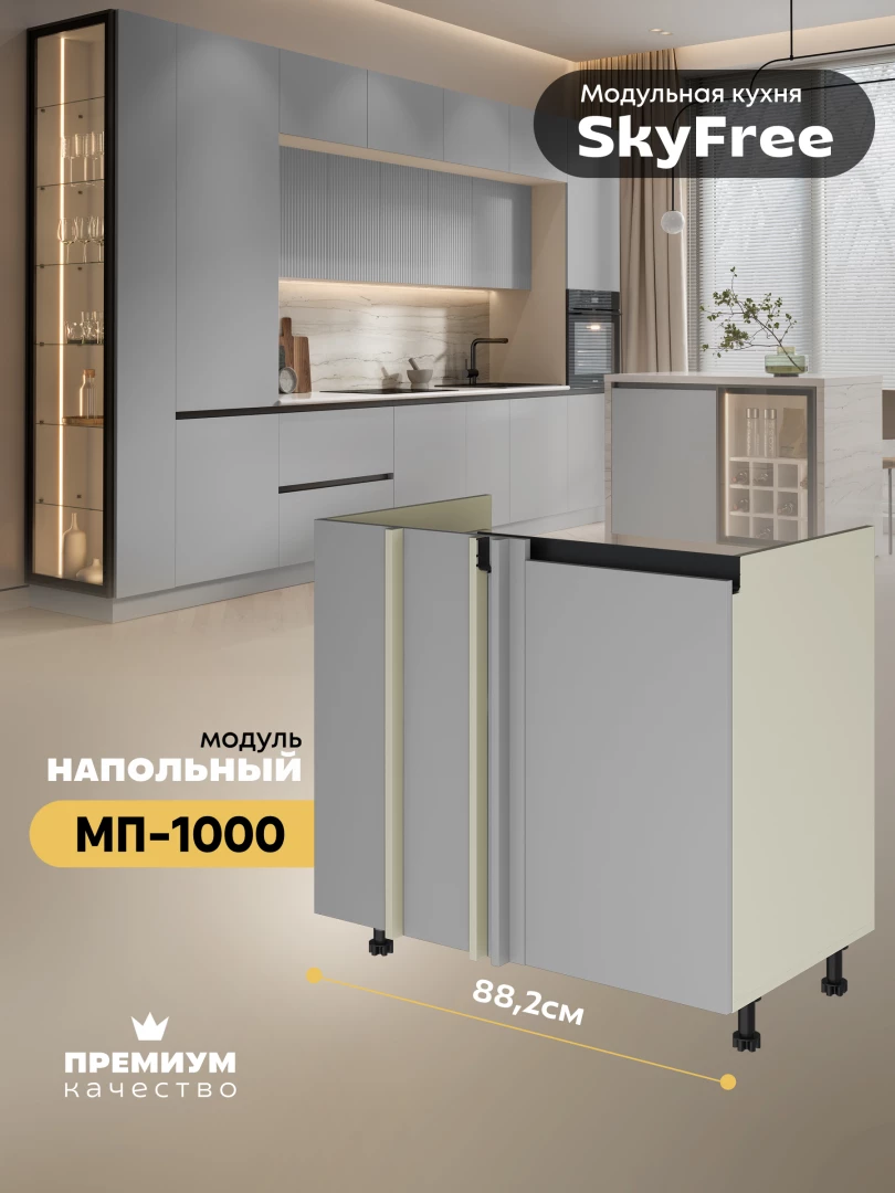 Кухня-гостинная СкайФри специально разработана для квартир с объединенной кухней и гостиной. Трехуровневые кухни оснащены антресолями. Большой выбор модулей. Уникальные модули и тумба-остров.