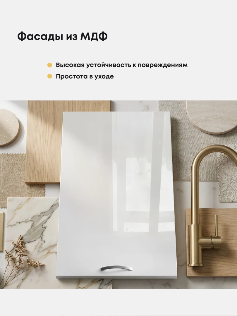 МДФ — это высокопрочный, влагостойкий и долговечный материал для изготовления мебельных фасадов. МДФ придает мебели дорогой и презентабельный вид. В процессе эксплуатации не оказывает отрицательного действия на здоровье человека. МДФ — это красивый дизайн, многообразие цвета и фрезеровки.