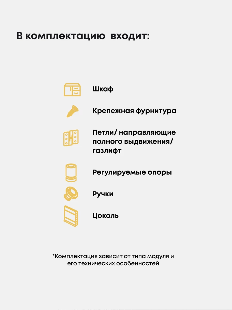 Петли позволяют крепить фасады на корпус шкафов. Качество используемой фурнитуры — гарантия долгой службы изделия. Петли и фурнитура нашей мебели обладают высоким запасом прочности и выдерживают значительные нагрузки, на протяжении всего срока эксплуатации.