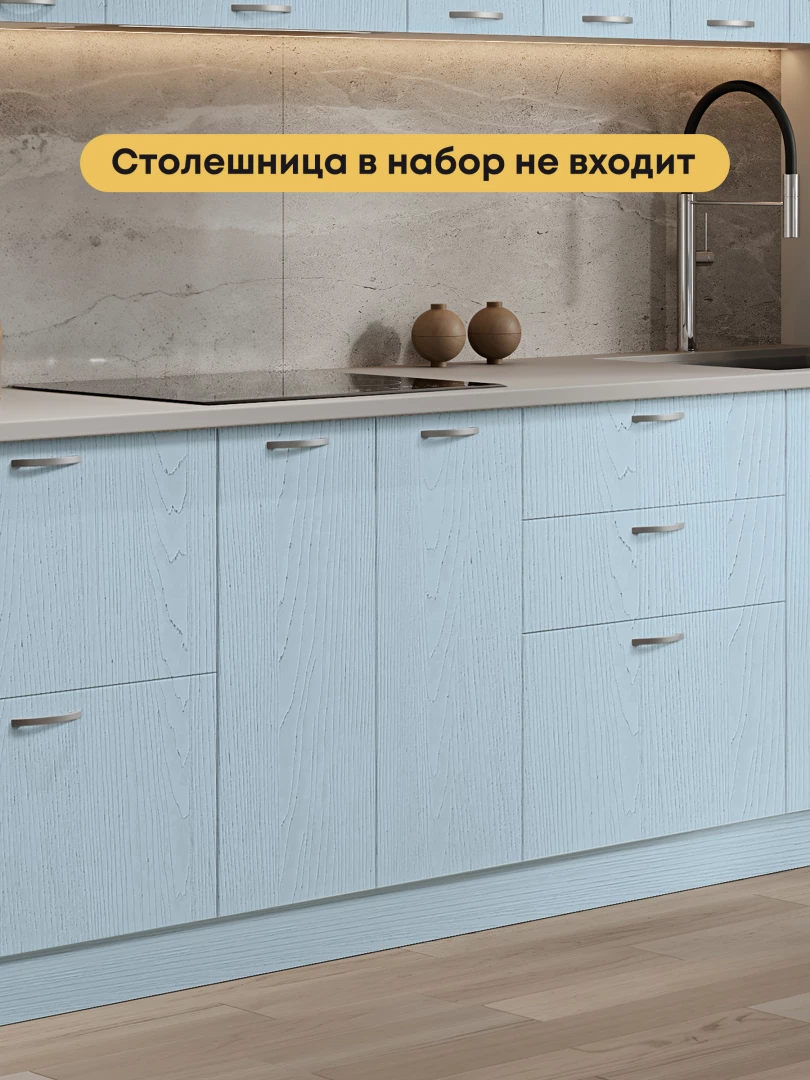 Модульная кухня «Вила Нео Мыло» имеет большой выбор модулей и две высоты навесных шкафов, что гарантирует удобство использования и помогает оптимально разместить все необходимое. Выполненные из МДФ фасады, выглядят дорого и благородно.
