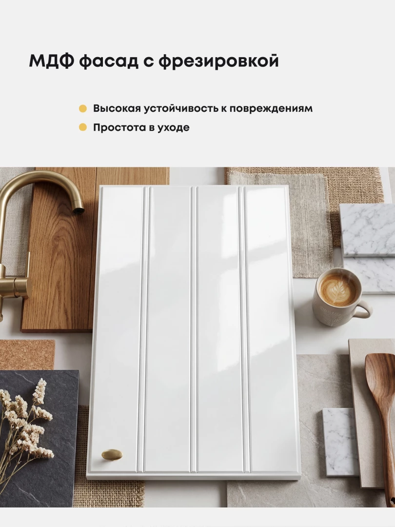 МДФ — это высокопрочный, влагостойкий и долговечный материал для изготовления мебельных фасадов. МДФ придает мебели дорогой и презентабельный вид. В процессе эксплуатации не оказывает отрицательного действия на здоровье человека. МДФ — это красивый дизайн, многообразие цвета и фрезеровки.