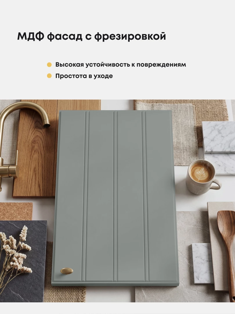 МДФ — это высокопрочный, влагостойкий и долговечный материал для изготовления мебельных фасадов. МДФ придает мебели дорогой и презентабельный вид. В процессе эксплуатации не оказывает отрицательного действия на здоровье человека. МДФ — это красивый дизайн, многообразие цвета и фрезеровки.
