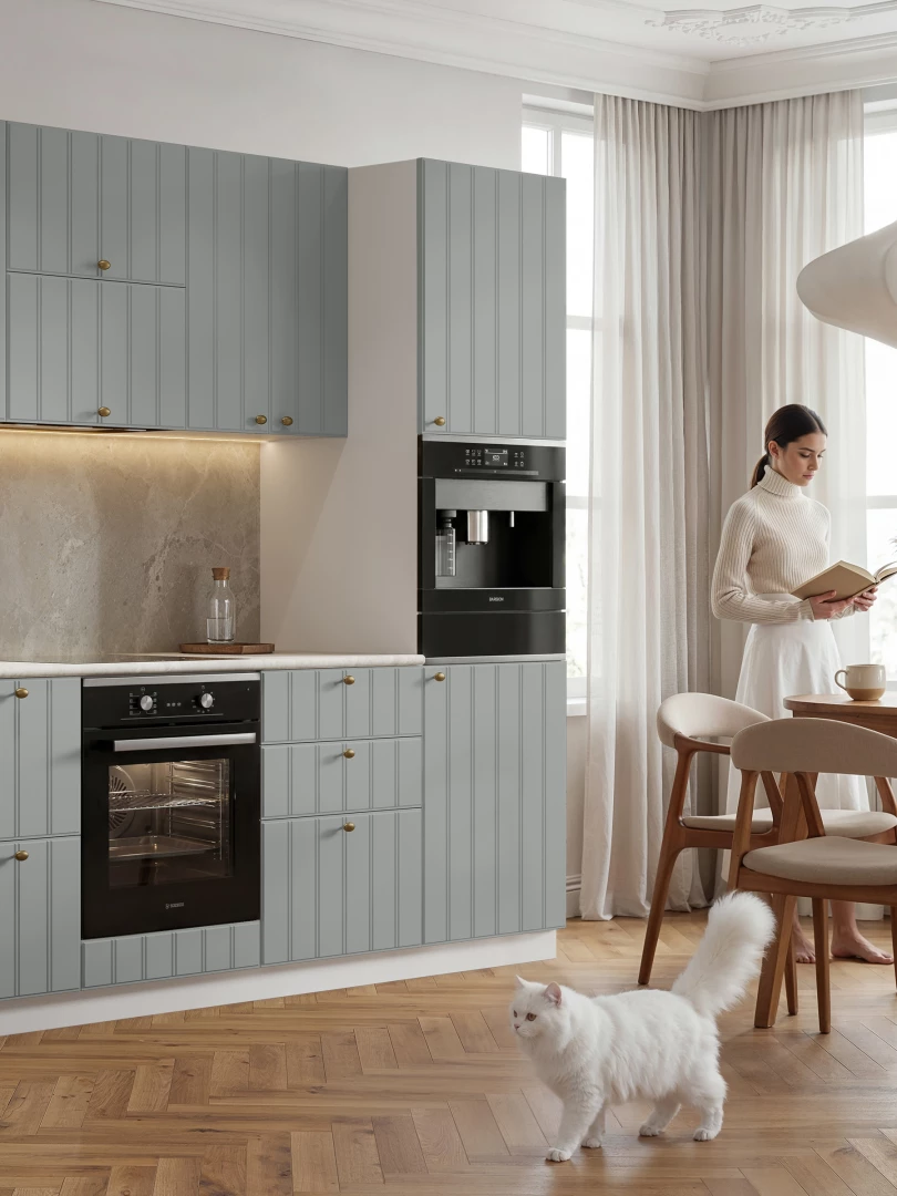 Преимуществом модульной кухни «Виола Нео Соренто» является широкая модульная линейка с большим выбором модулей. Две высоты навесных шкафов гарантирует удобство использования и помогает оптимально разместить все необходимое. Дизайн фасадов с вертикальными полосками меняет восприятие пространства – визуально раздвигает, добавляет воздушности. Фасады, выполненные из МДФ, придают мебели дорогой презентабельный вид. В процессе эксплуатации не оказывает отрицательного действия на здоровье человека.