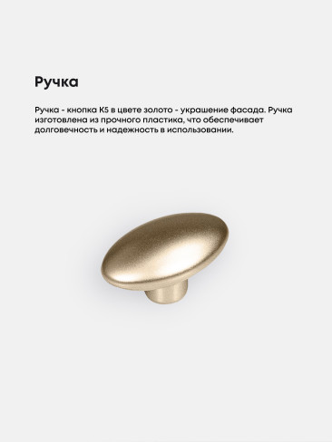 Ручка-кнопка К5 в цвете золото – украшение фасада. Ручка изготовлена из прочного пластика, что обеспечивает долговечность и надежность в использовании. Фасады представлены в 15 цветовых решениях, что позволит органично вписать данную кухню в любой современный дизайн.