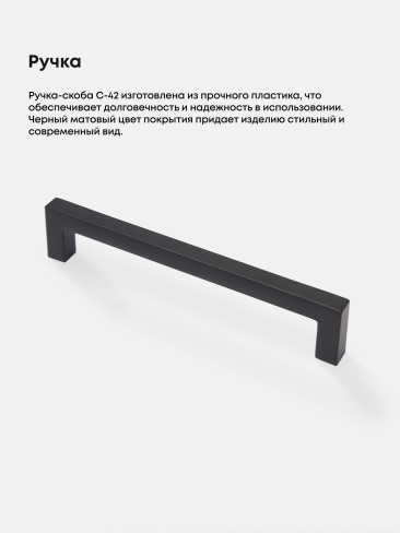 Ручка-скоба С-42 изготовлена из прочного пластика, что обеспечивает долговечность и надежность в использовании. Черный матовый цвет покрытия придает изделию стильный и современный вид. Фасады представлены в 15 цветовых решениях, что позволит органично вписать данную кухню в любой современный дизайн.