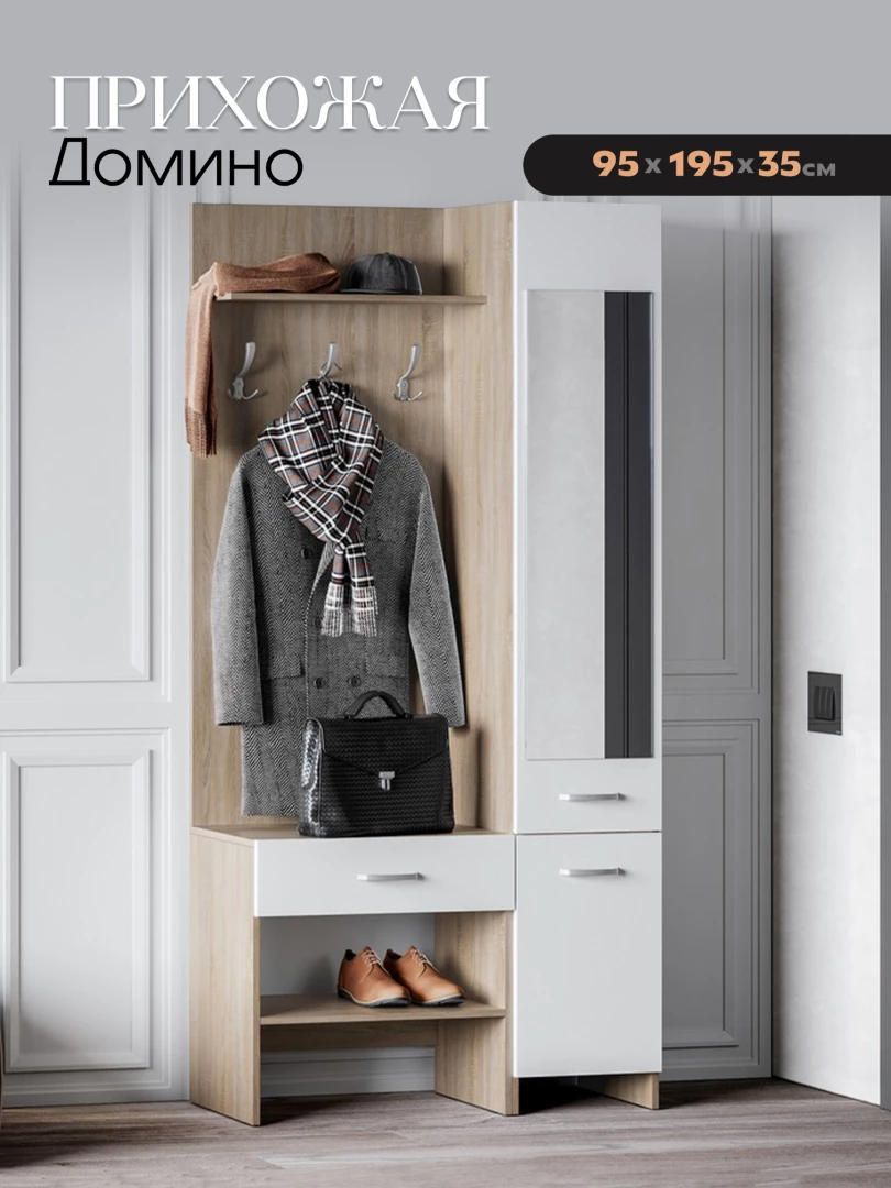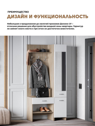 Небольшая и продуманная до мелочей прихожая Домино-2У – отличное решение для обустройства входной зоны квартиры. Гарнитур «Домино» не займет много места и при жтом он достаточно вместителен для того, чтобы без проблем принять одежду целой группы гостей вашего дома.