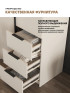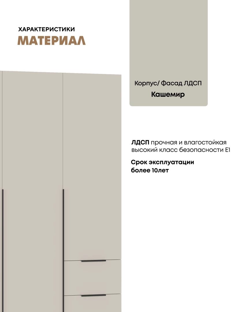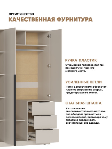 • Элегантный дизайн: Накладные фасады, петли без доводчика, правая створка без ручки, а две левых створки и фасады ящиков оснащены стильными черными пластиковыми ручками.